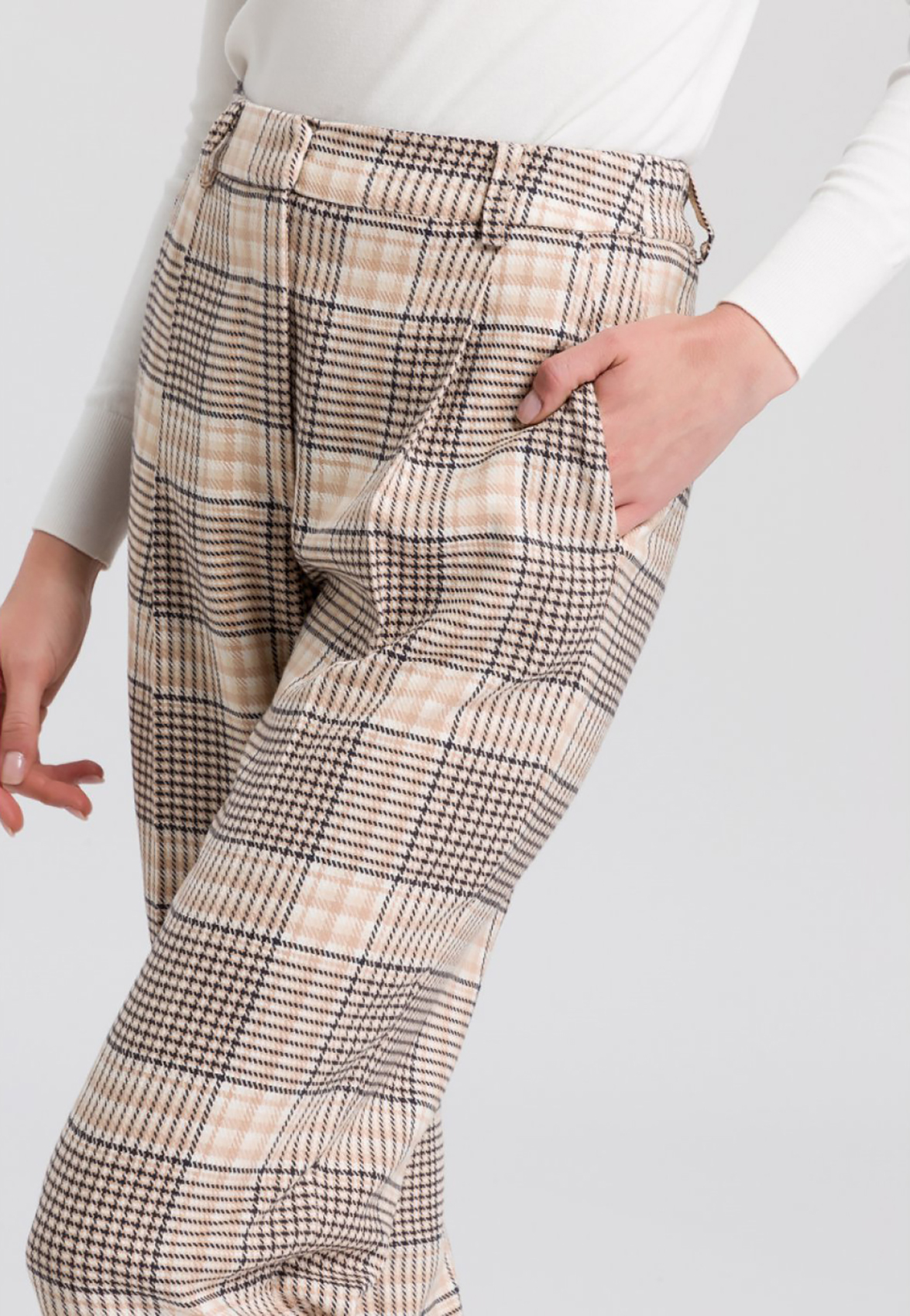 Укороченные клетчатые брюки высокой посадки. Боковые карманы, прорезные карманы с листочкой сзади. Застежка-молния. Трендовый вариант низа для актуальных образов.