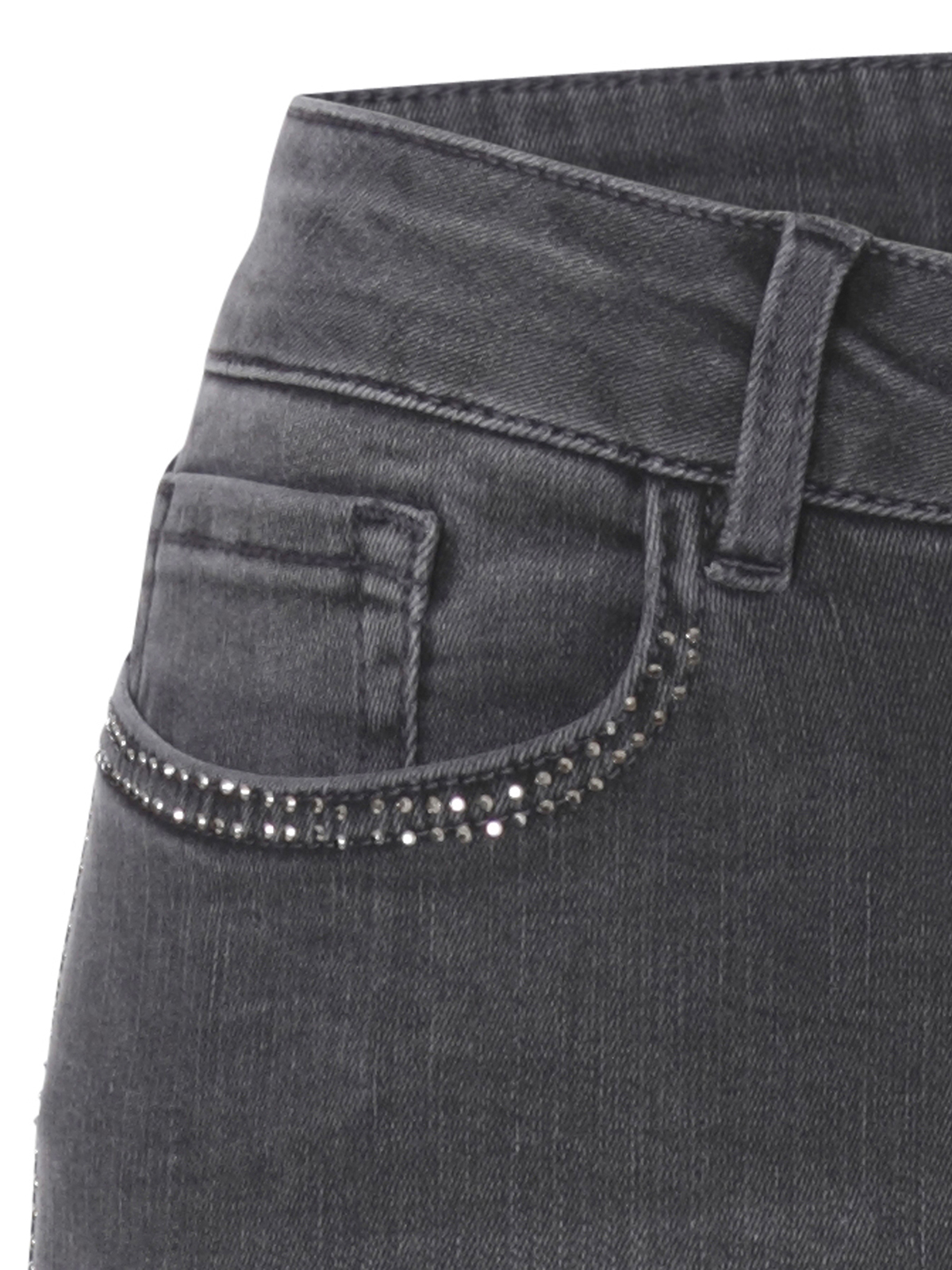 Серые джинсы силуэта slim. Декоративные потертости и складки. Комфортная высокая посадка, притачной пояс со шлевками. Застежка на пуговицу и скрытую молнию. Внутренние боковые карманы и два накладных кармана сзади.