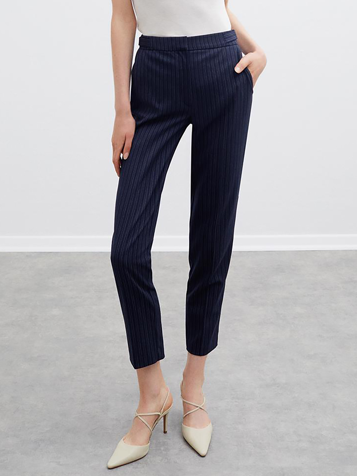 Укороченные брюки насыщенного синего оттенка с контрастной полоской. Высокая посадка, притачной пояс со шлевками, застежка на скрытую молнию. Боковые карманы. Брюки подойдут для создания образа в деловом стиле.