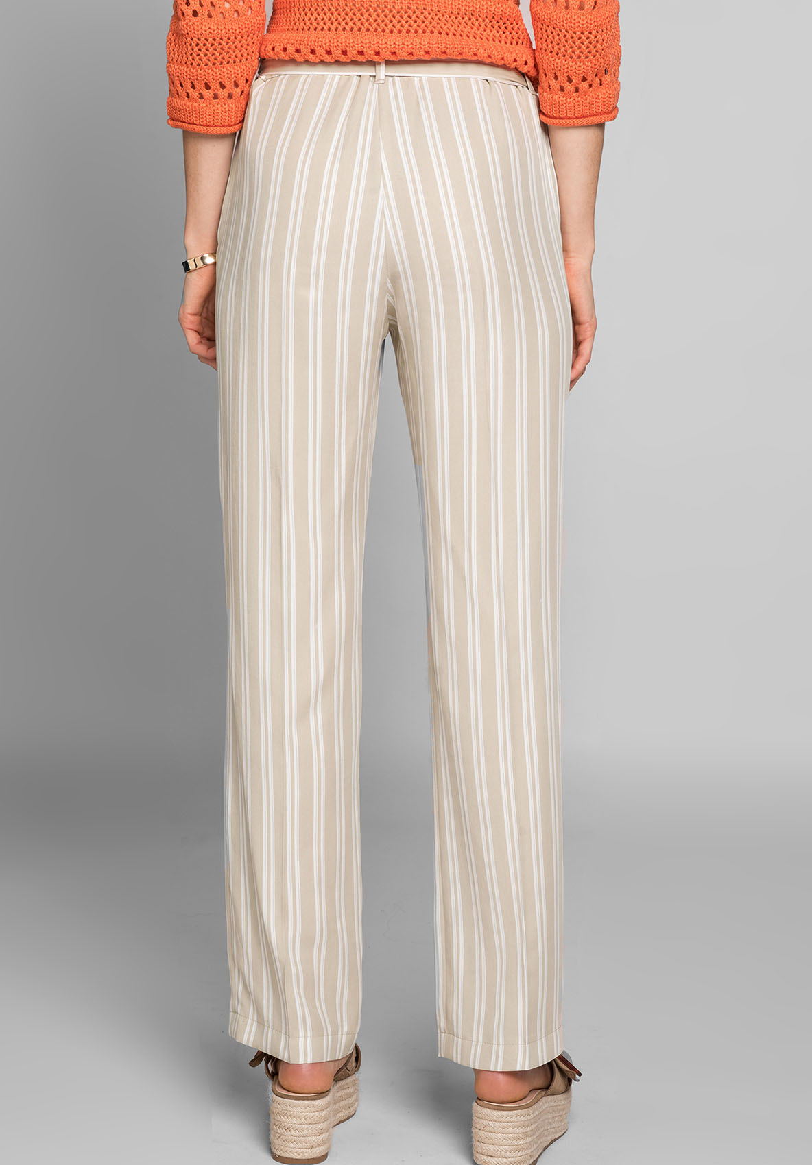 Брюки Parigi придают вашему образу непринужденный повседневный шик. Брюки свободного силуэта имеют боковые карманы и тканевый ремень на поясе. Высокое качество и мягкость материала делают брюки особенно удобными, а прямая широкая нога обеспечивает комфорт. Узкие продольные полосы визуально удлиняют ногу. Это идеальные брюки на любой случай! • повседневные брюки в полоску • качественный и легкий в уходе материал • боковые карманы, эластичная лента на поясе, тканевый ремень • прямой крой • длина около 82 см