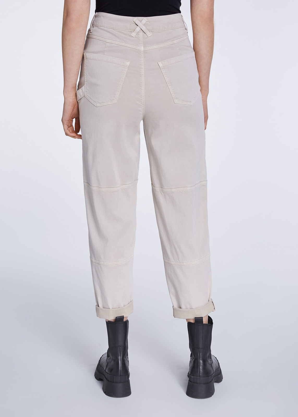 Однотонные брюки прямого кроя с рельефами. Комфортная высокая посадка, пояс со шлевками, застежка на скрытую молнию и пуговицу. Накладные передние карманы на молнии.