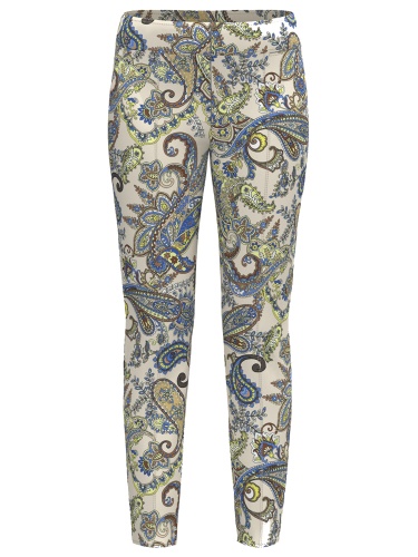 Укороченные брюки выполненные в узоре пейсли - яркий вариант низа на теплый сезон. Ткань из смесового льна приятна к телу и гарантирует долговечность изделия. Притачной пояс без шлевок, боковые карманы.