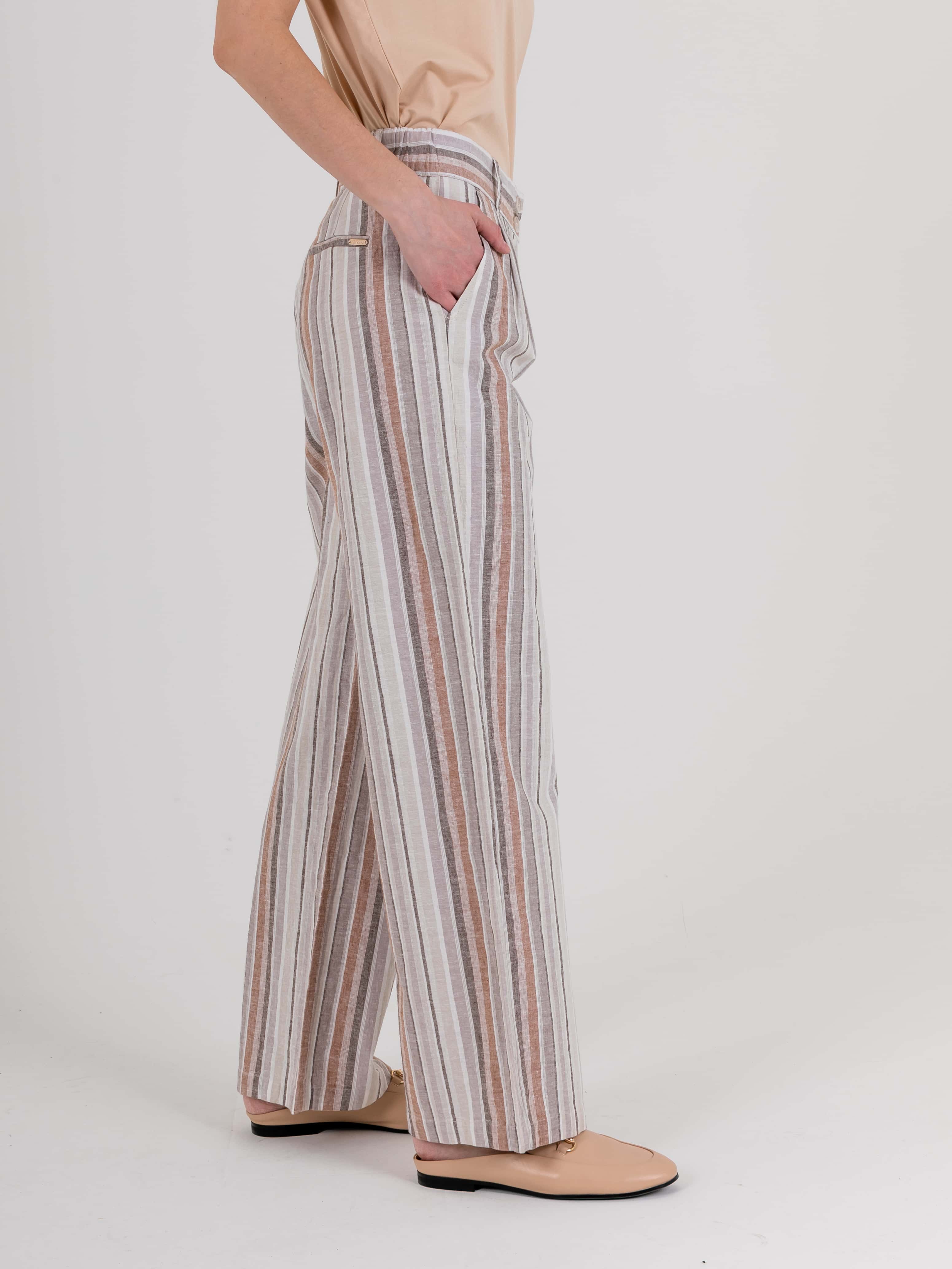 На сайте указаны российские размеры. Ткань: комфортный для тела, максимально дышащий материал изо льна и хлопка (55% лен, 45% хлопок). Крой: летние расклешенные брюки со средней посадкой. Благодаря продольной полоске визуально удлиняют силуэт, делая его стройным и подтянутым. Имеет два функциональных кармана спереди и два прорезных – сзади. Качественный крой и идеальная посадка обеспечивают комфорт и удобство при движении. Отделка: застегиваются на две удобные пуговицы и молнию. Шлевки на поясе позволяют дополнить брюки ремнем или поясом.
