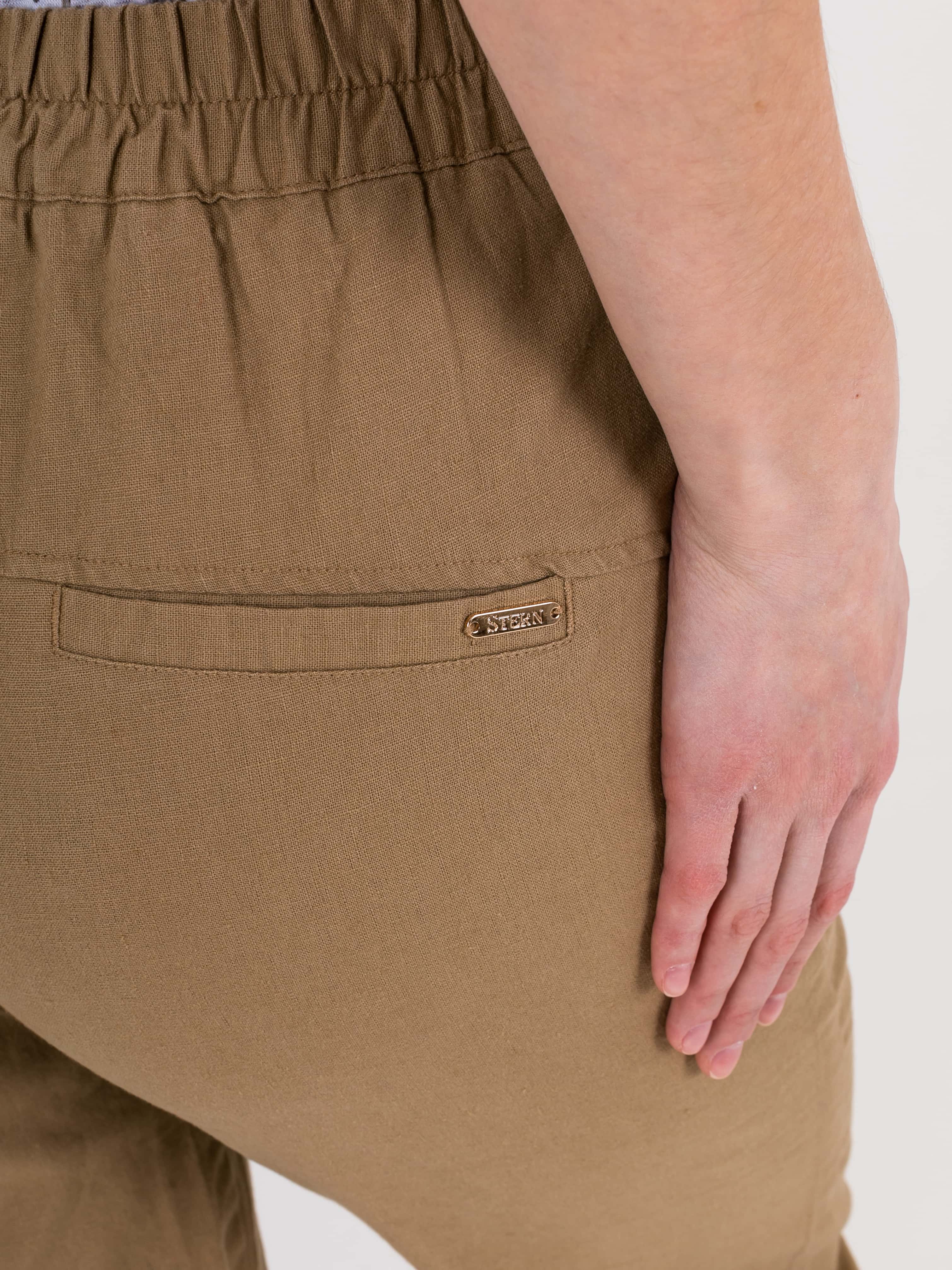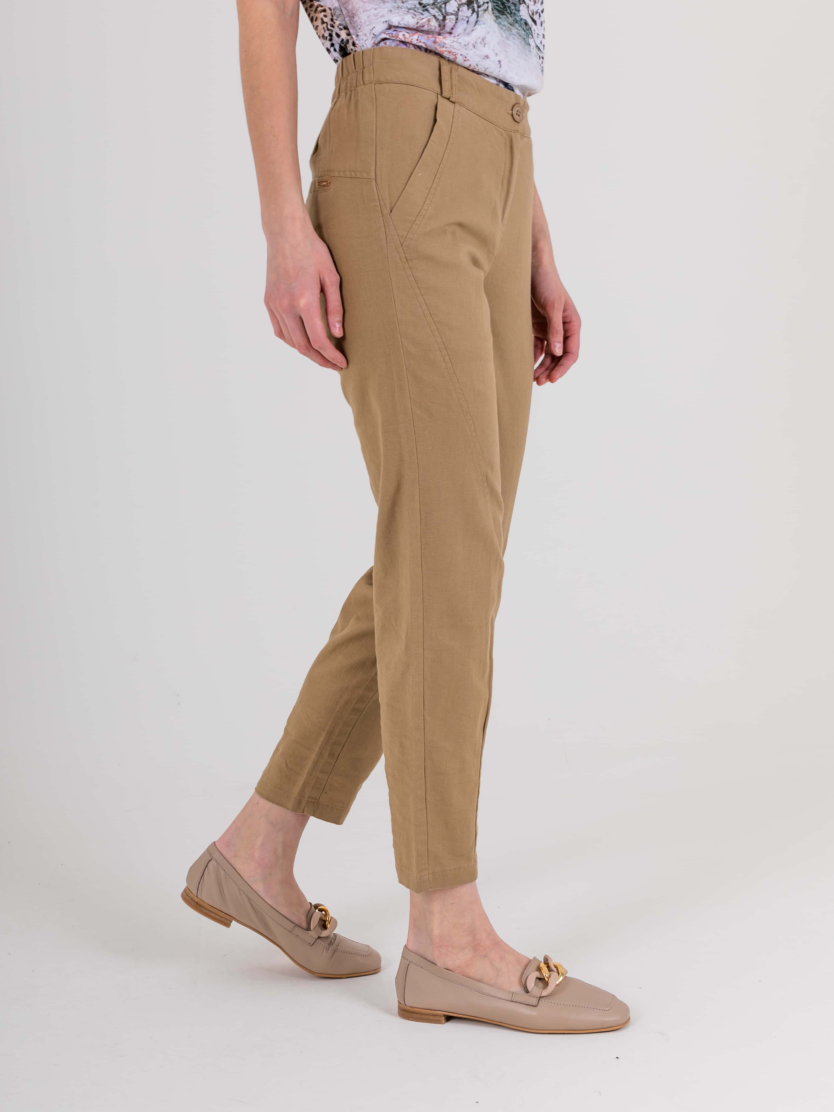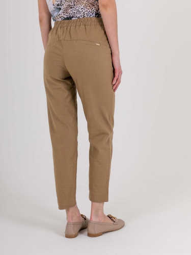 На сайте указаны российские размеры. Крой: стильная укороченная модель, красиво садящаяся по фигуре. Благородный бежевый оттенок, высокая посадка и функциональные карманы делают эти брюки абсолютным must-have во все времена. Создают подтянутый, стройный силуэт, удлиняют ноги и мастерски скрывают все недостатки. Отделка: оригинальные строчки в тон ткани, расположенные в верхней и нижней частях брюк, создают дополнительные вертикали и стройнят фигуру. Сзади расположены два прорезных кармана. Застегиваются на молнию и пуговицу. Имеют шлевки, что позволяет дополнять образ ремнем.