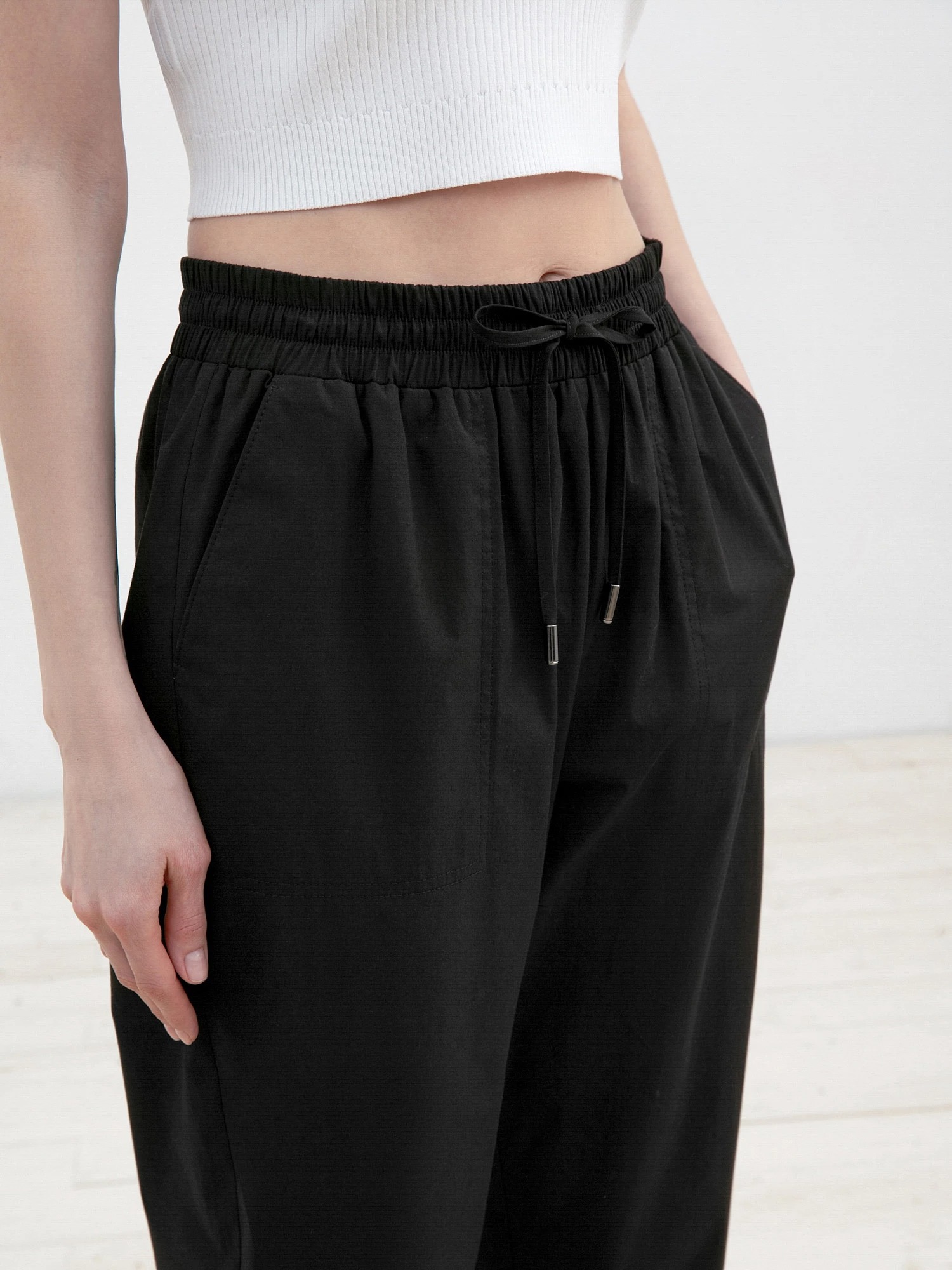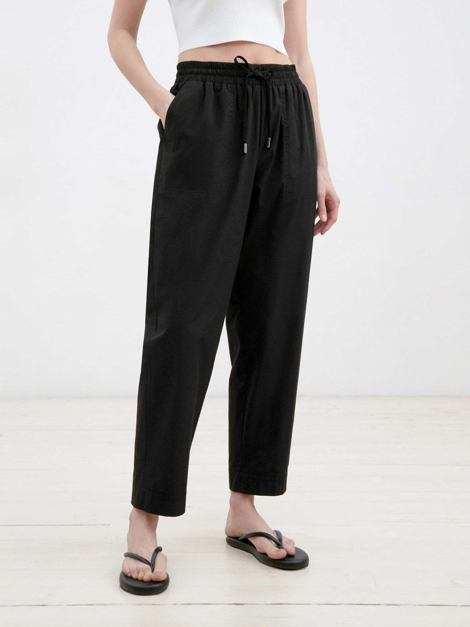 Стильные брюки из хлопковой ткани трендового силуэта бананы с резинкой и завязками на талии для комфортной посадки и крупными отстроченными карманами.
