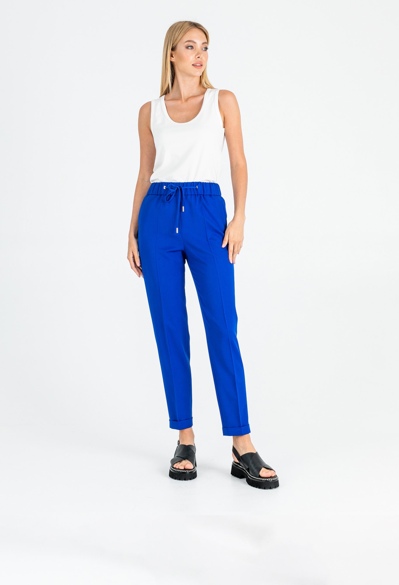 На сайте указаны российские размеры. Ткань: смесовая ткань средней плотности (72% полиэстер, 22% вискоза, 6% эластан). Идеальны для лета и весны. Крой: повседневные брюки в стиле спорт-шик – выбор активных женщин, для которых важен не только комфорт, но и внешний вид одежды. Имеют слегка прилегающий силуэт, подчеркивающий красоту фигуры. Модель с завышенной талией, прикрывает зону живота. Удобный пояс-резинка обеспечивает максимальный комфорт и надевание брюк в течение нескольких секунд. Отделка: модель с двумя функциональными прорезными карманами спереди и двумя карманами сзади. Стрелка на брюках «снижает» градус спорта и добавляет женственной повседневности. Манжеты подчеркивают красоту щиколоток, а тонкий шнурок с серебряными концами позволяет регулировать ширину пояса. Параметры модели: 86-61-91 см Рост 177 см