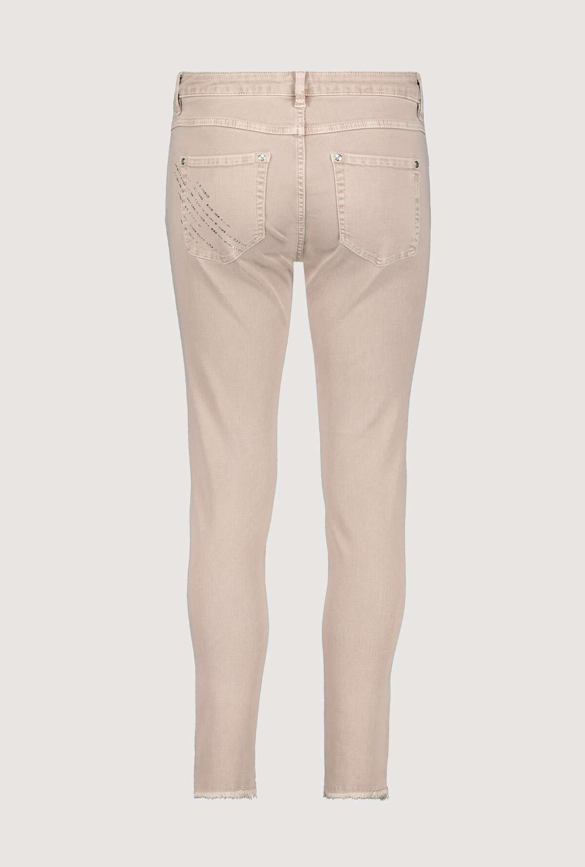 На сайте указаны российские размеры. Узкие джинсы с пятью карманами и эффектными стразами. Узкий крой с петлями для ремня на поясе, классическая посадка и пять карманов. Низ штанин украшен стильной бахромой, а сверкающие полоски со стразами эффектно украшают модель. Параметры модели: 42 размер, рост 179 см