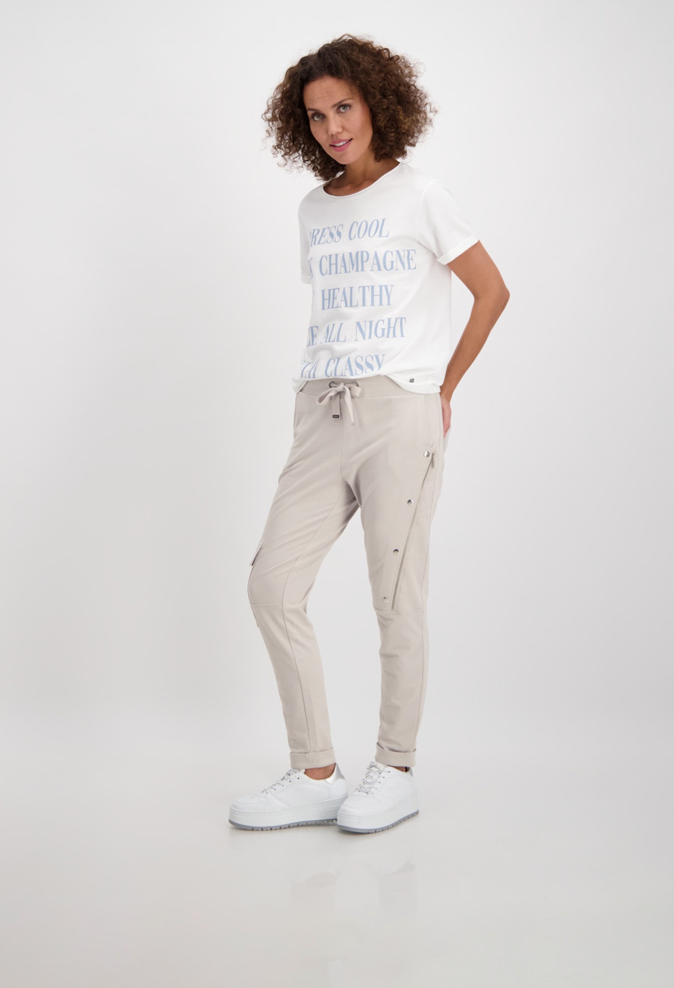 На сайте указаны российские размеры. Спортивные джоггеры monari в байкерском стиле. Пояс украшен декоративными пуговицами, талия на кулиске с проушинами и завязками, а также ребристая спинка. Боковые карманы, накладной карман с клапаном на уровне колена на правой штанине и диагональный шов с застежкой-молнией и декоративными пуговицами на левой штанине завершают дизайн довольно простой модели джоггеров. Параметры модели: 42 размер, рост 179 см