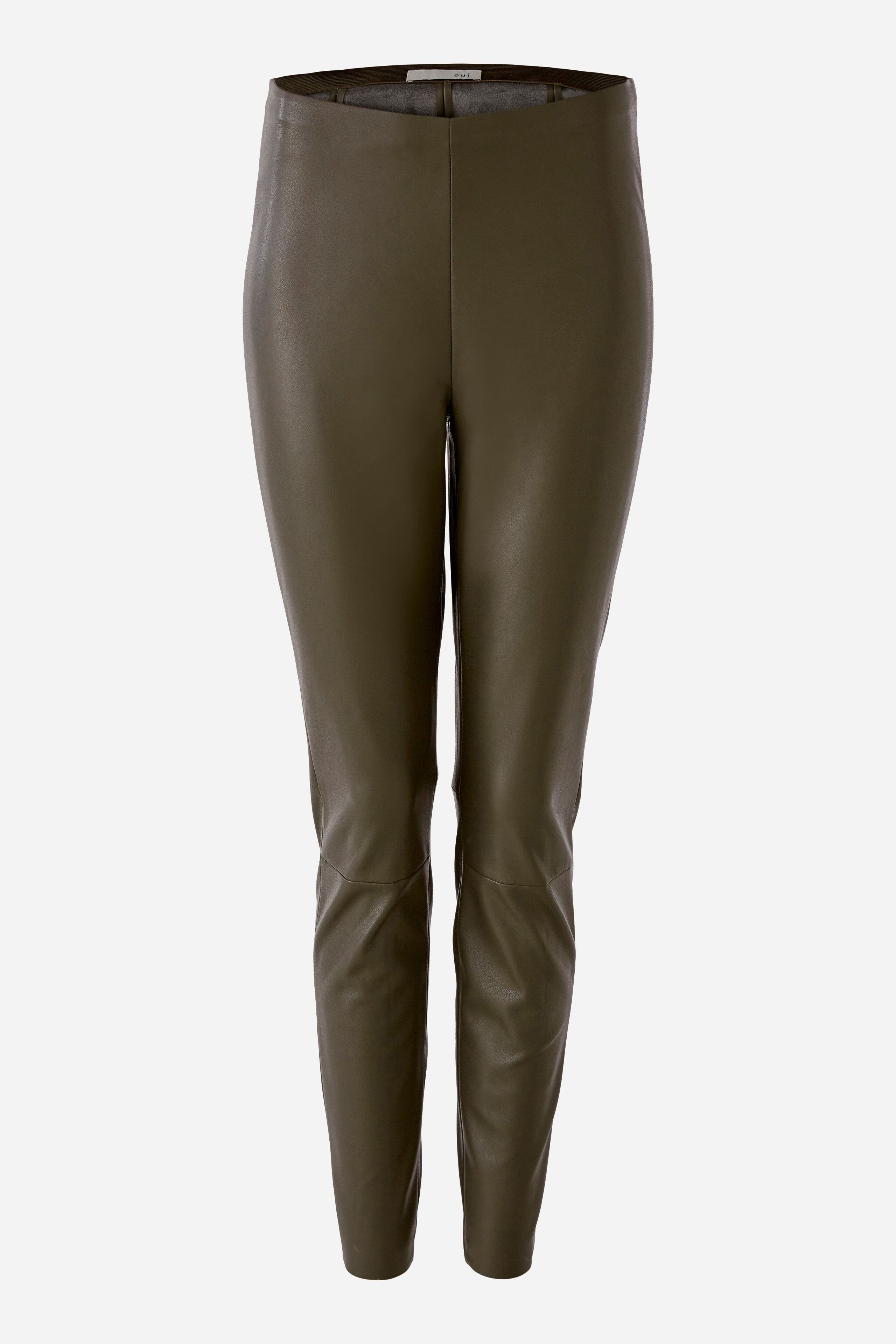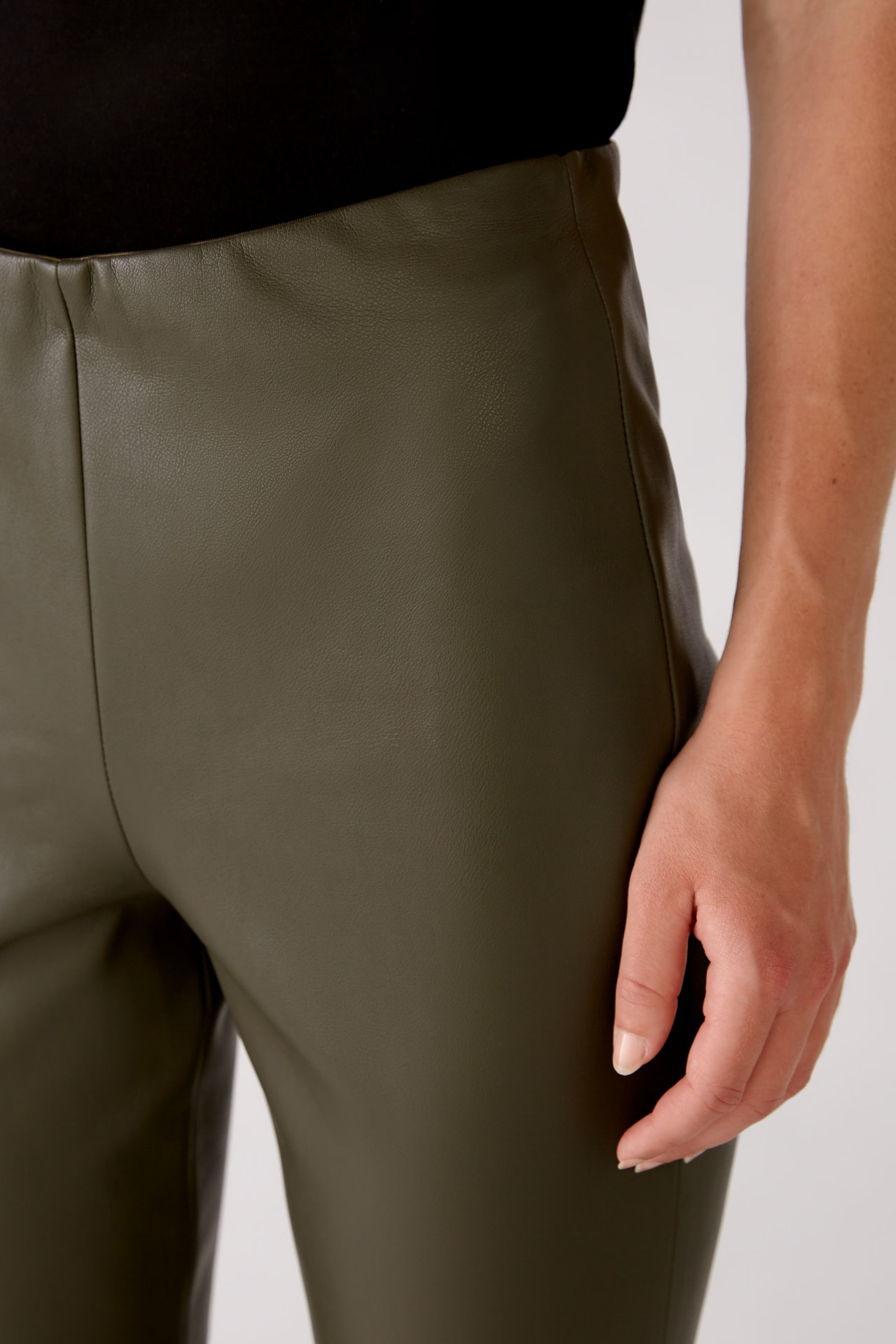 На сайте указаны российские размеры. Очень мягкая эластичная искусственная кожа. Удобный фасон без застежек благодаря эластичному поясу. Средняя талия и стандартная длина. Декоративные швы на коленях и спине. Без карманов. Рост модели 178 см
