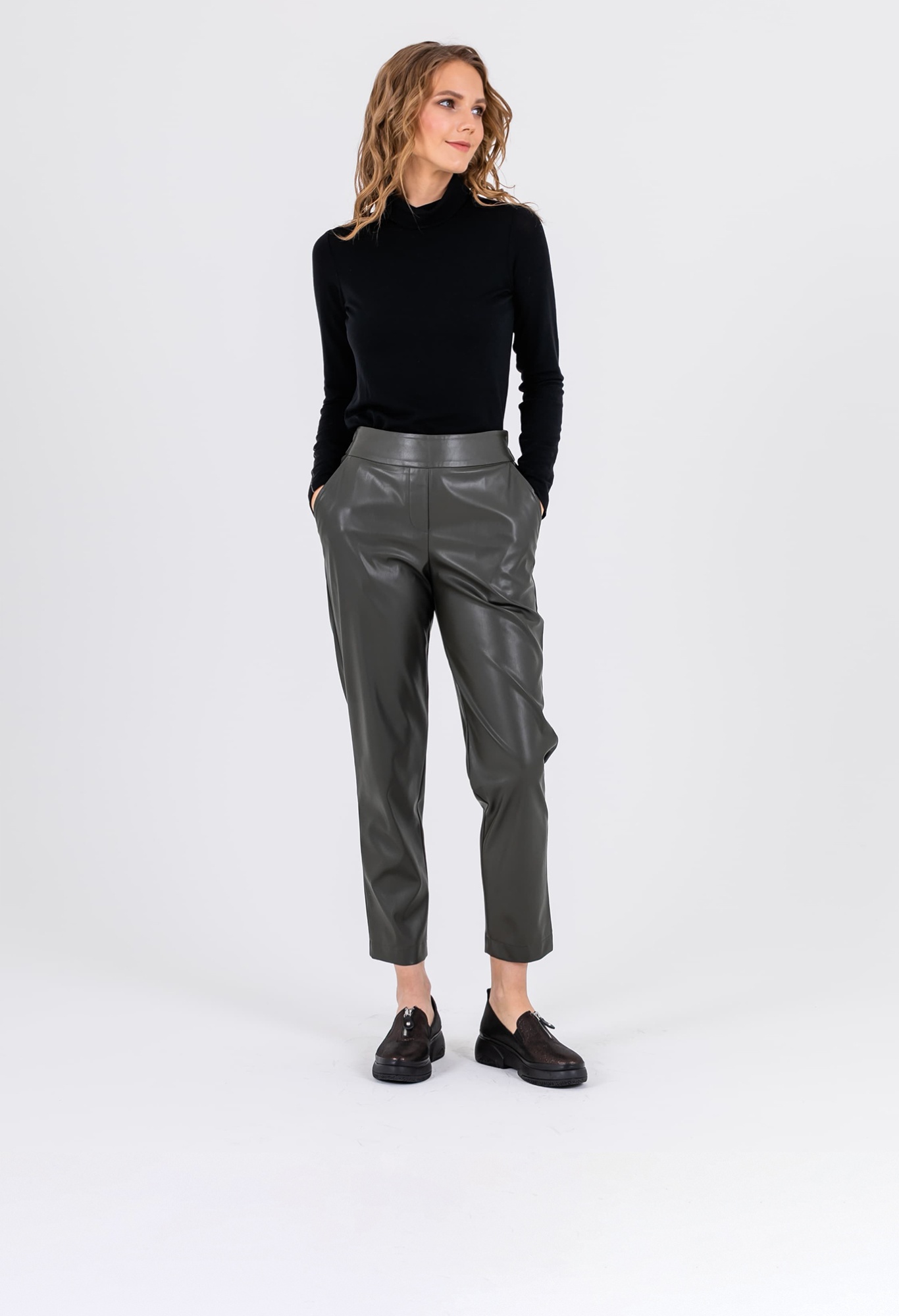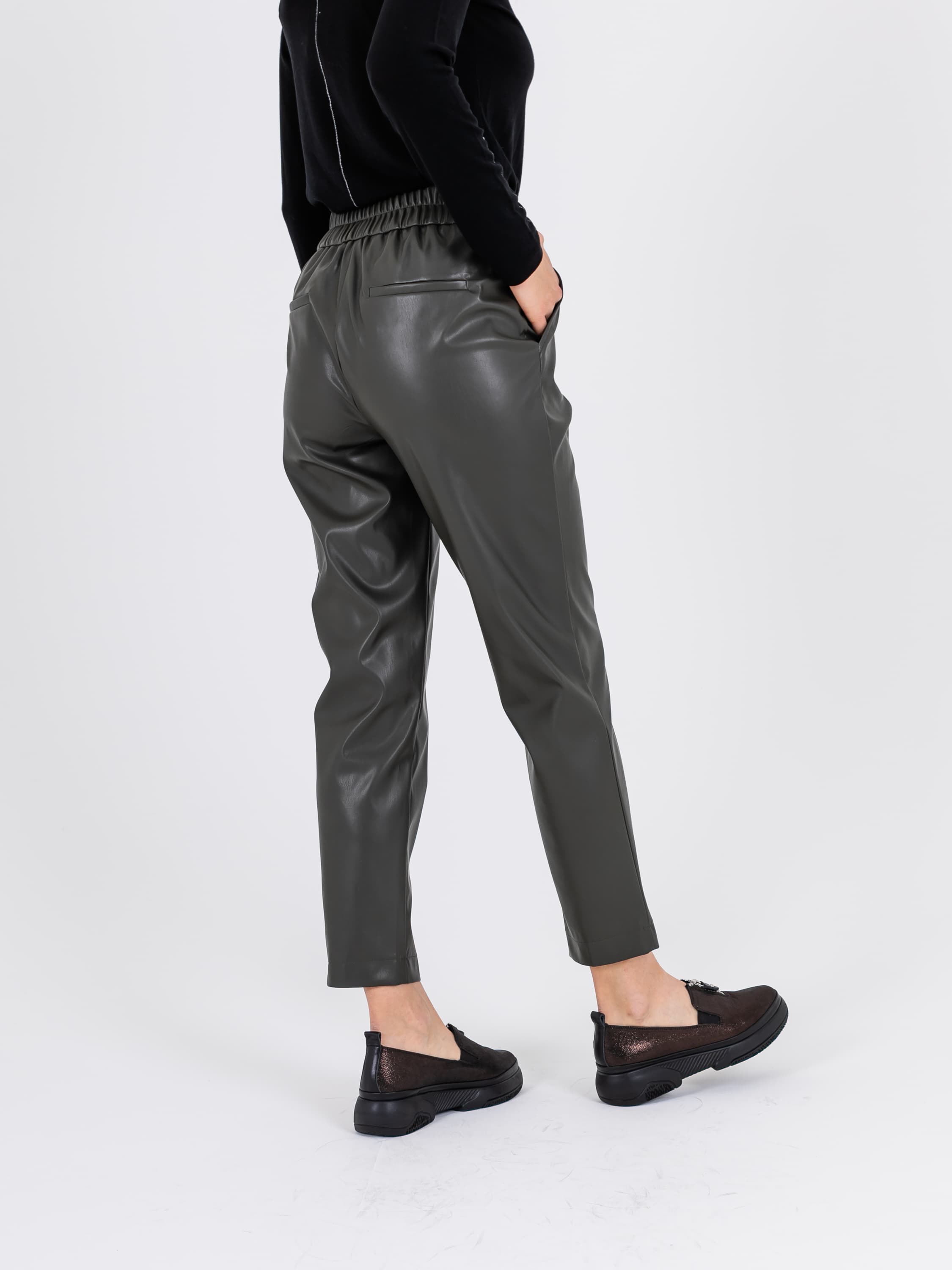 На сайте указаны российские размеры. Слегка укороченные брюки из экокожи в цвете хаки - просто писк моды. Брюки на резинке сзади. Модель имеет 4 кармана: 2 спереди и 2 сзади. Ткань: 55% полиуретан, 40% поливискоза, 5% эластан. Практичный материал, загрязнения с которого легко удаляются влажной салфеткой, что особенно актуально в межсезонье. Крой: ультрастильные кожаные брюки длины 7/8. Имеют средне-высокую посадку, которая подчеркивает красоту талии и скрывает недостатки в области живота. Прямой силуэт подходит под разные типы фигуры, уравновешивает область бедер и позволяет добиться максимального комфорта при движении. Брюки имеют два функциональных кармана спереди и два прорезных сзади. Отделка: особенностью модели является оригинальная зона пояса: гладкая спереди и собранная резинкой – сзади. Этот элемент обеспечивает дополнительный комфорт при надевании. Рост модели: 173 см