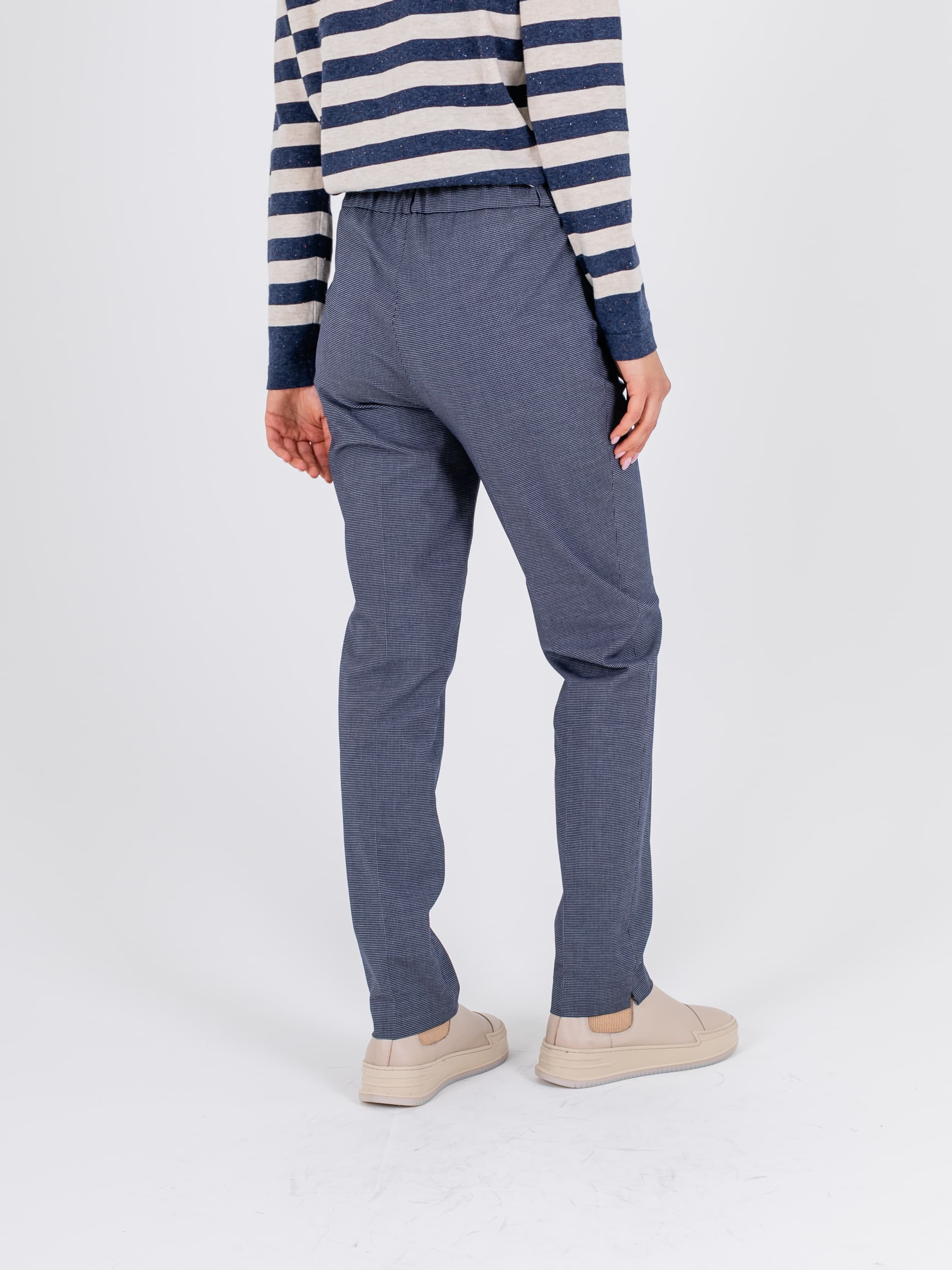 На сайте указаны российские размеры. Ткань: гладкая костюмная ткань в клетку (32% вискоза, 62% полиэстер, 6% эластан) Крой: брюки прямого силуэта с высокой линией талии. Имеют стрелку, которая создает дополнительную вертикаль и делает образ законченным. Модель выделяется оригинальными горизонтальными квадратными карманами, не уступающими по функциональности стандартным. Застегиваются на молнию и пуговицу. Отделка: в задней части на поясе создается легкая сборка. Разрезы в области щиколоток добавляют комфорта при движении. Рост модели: 175 см.