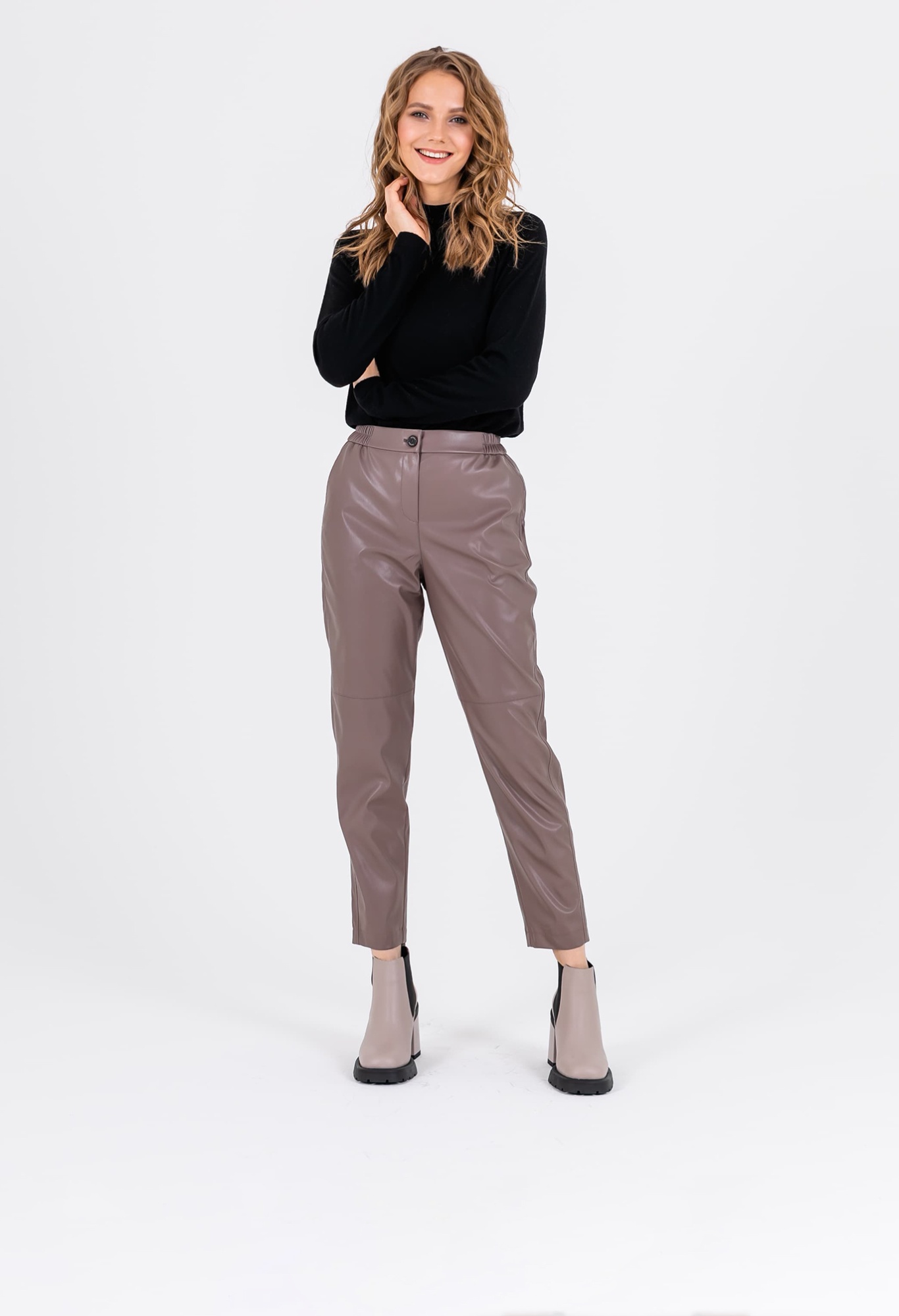 На сайте указаны российские размеры. Брюки из экокожи слегка укороченные в бежевом цвете. Впереди застежка на молнию и пуговицу, сзади эластичная резинка. Модель имеет 2 кармана спереди. Ткань: искусственная кожа высокого качества (55% полиуретан, 40% поливискоза, 5% эластан). Практичный материал, загрязнения с которого легко удаляются влажной салфеткой, что особенно актуально в межсезонье. Крой: прямой свободный силуэт создает идеальную вертикаль, которая визуально вытягивает и стройнит фигуру, корректируя область бедер. Имеют актуальную высокую посадку. Удобные карманы по бокам вместят все самое важное, что может пригодиться в ближайшее время. Застегиваются на пуговицу и молнию. Стильный оттенок тауп подчеркнет прекрасный вкус и чувство стиля. Отделка: верхняя и нижняя часть брюк разделяются неконтрастной строчкой, которая добавляет оригинальности, но не перегружает образ. Рост модели 175 см.