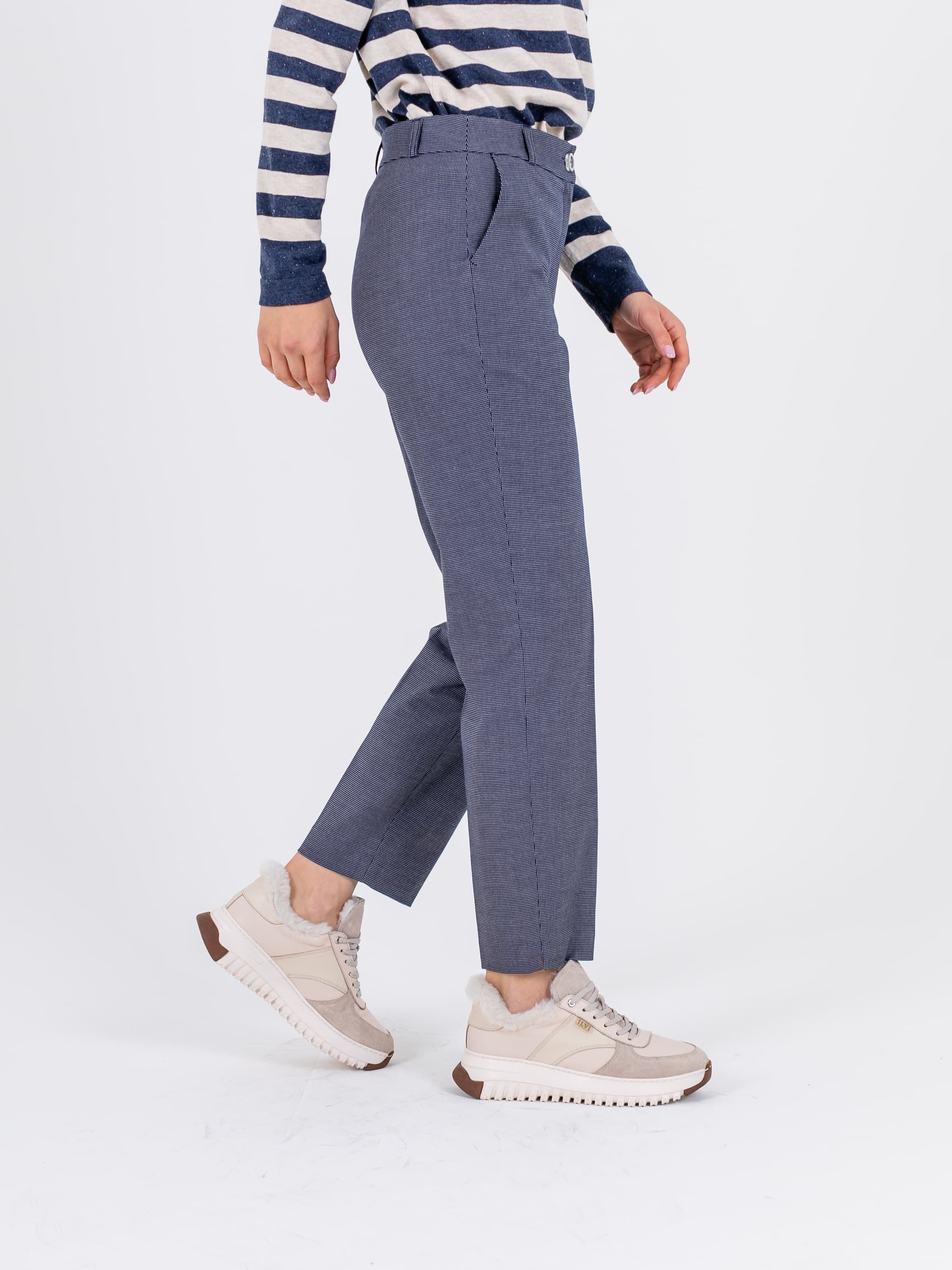 На сайте указаны российские размеры. Ткань: гладкая костюмная ткань в клетку (32% вискоза, 62% полиэстер, 6% эластан) Крой: брюки прямого силуэта с высокой линией талии, которая подчеркивает достоинства фигуры. Имеют стрелку, создающую дополнительную вертикаль и делающую образ законченным. Два функциональных кармана можно использовать для хранения важных вещей, которые не хочется держать в руках. Застегиваются на молнию и пуговицу. Отделка: в модели предусмотрены шлевки, в которые можно вдеть тонкий пояс или платок. Рост модели: 175 см.