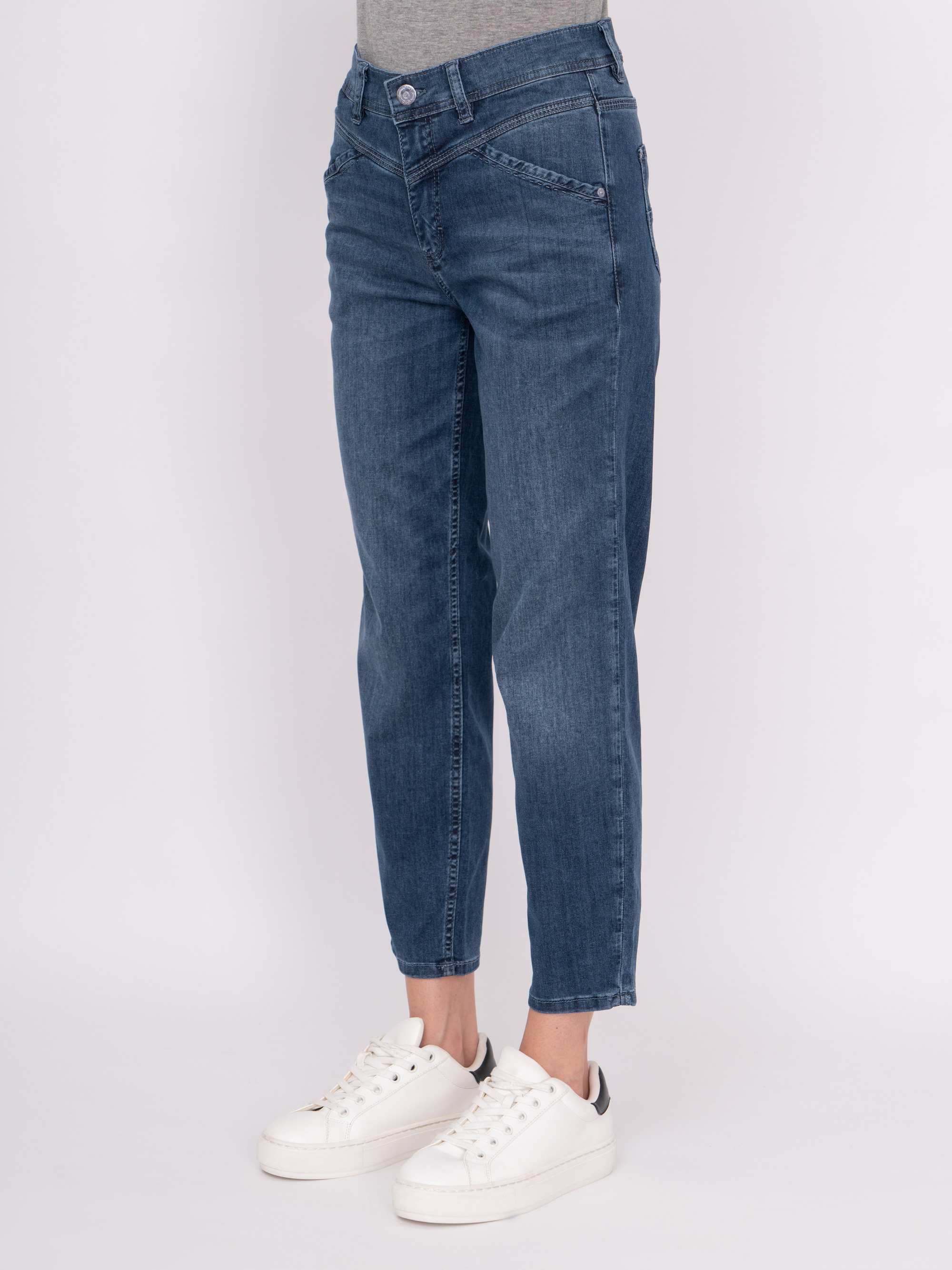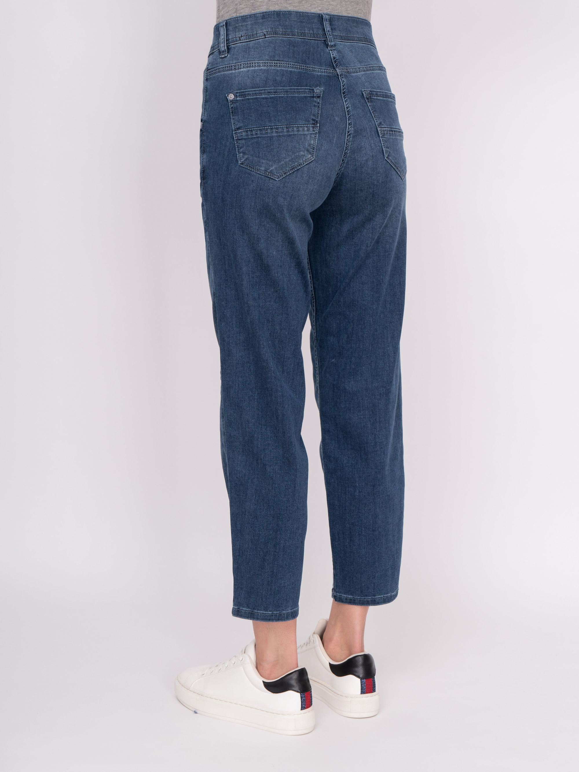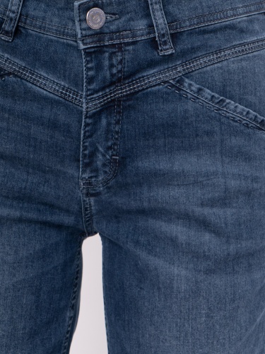 На сайте указаны российские размеры. Зауженные укороченные синие джинсы на молнии с косыми карманами, с накладными карманами. Рост модели 175 см. Длина брюк: 67 см.