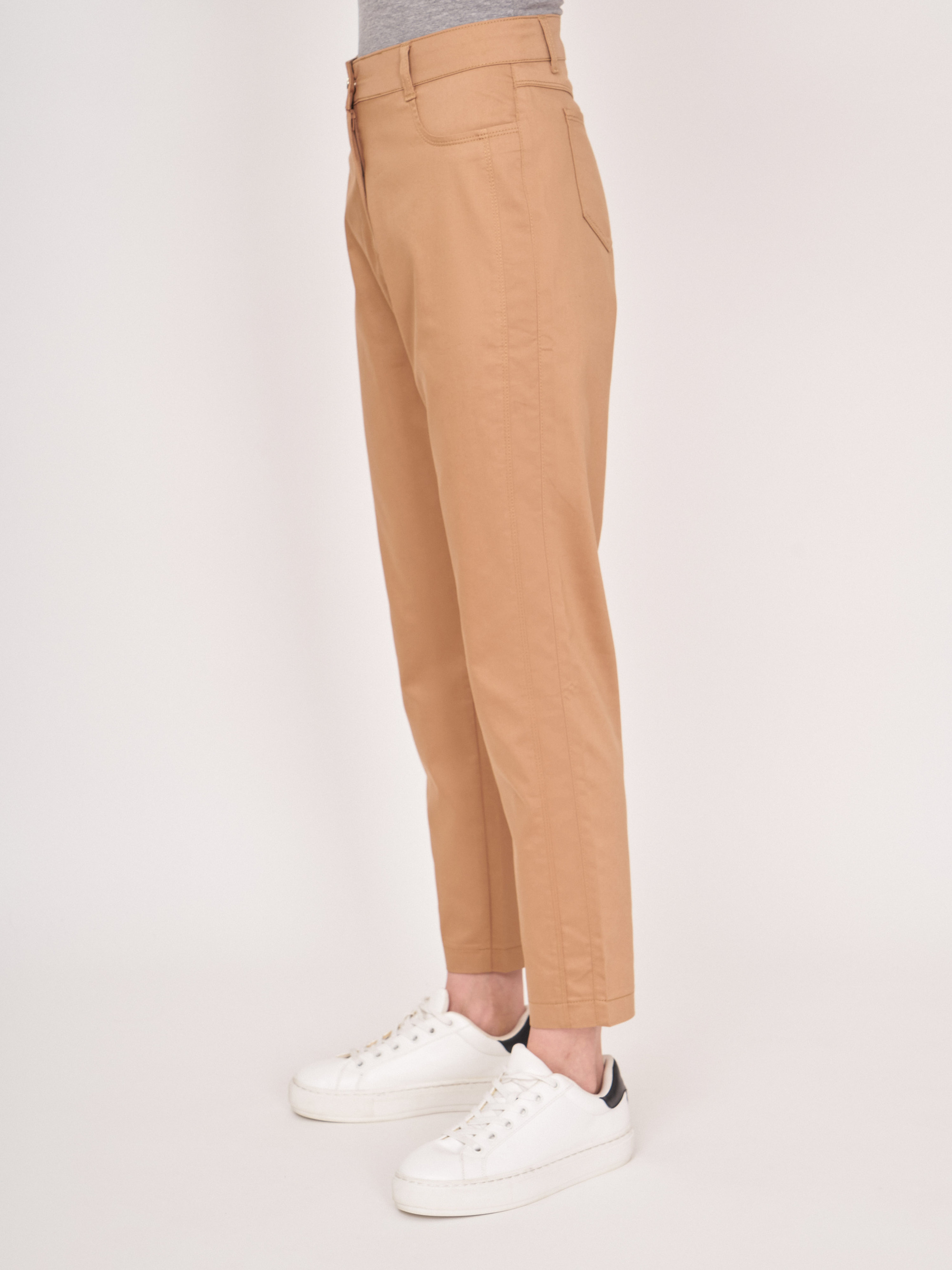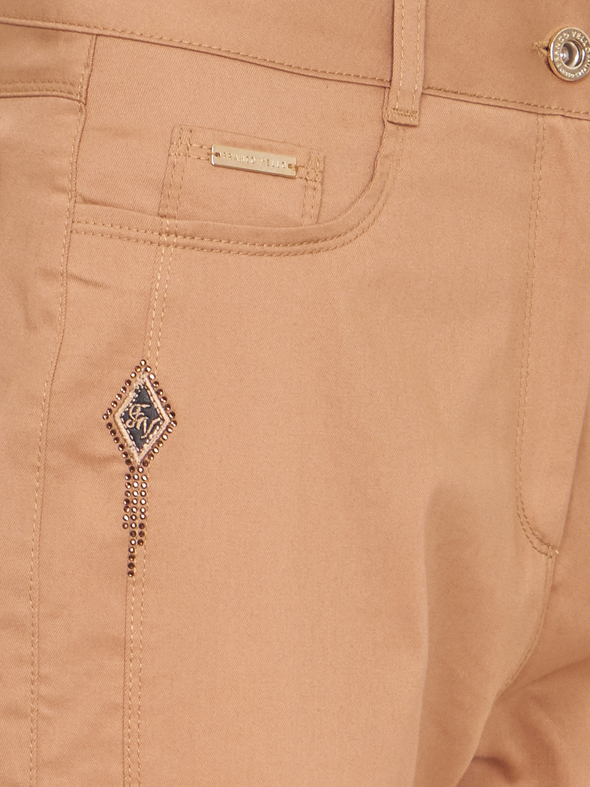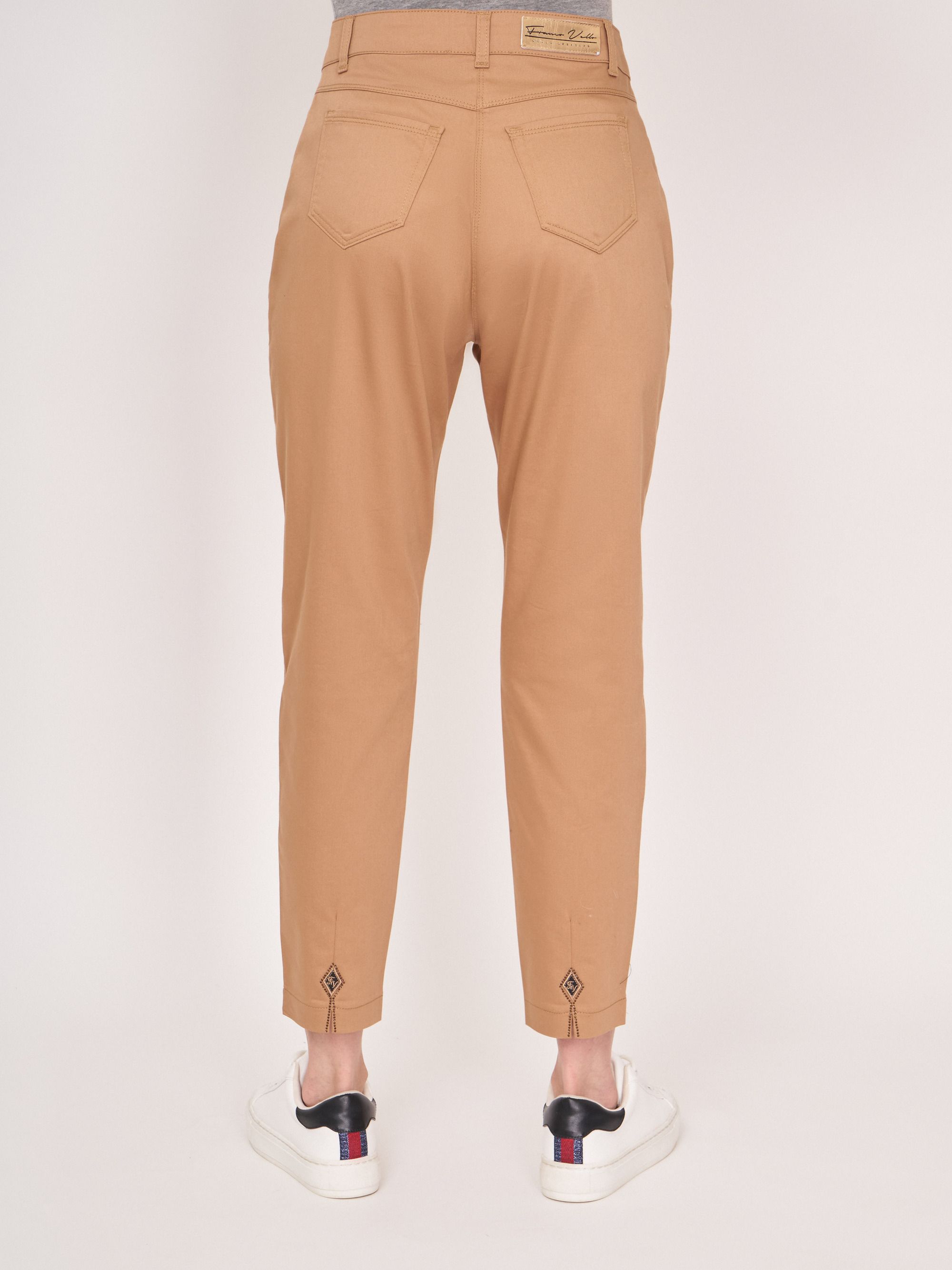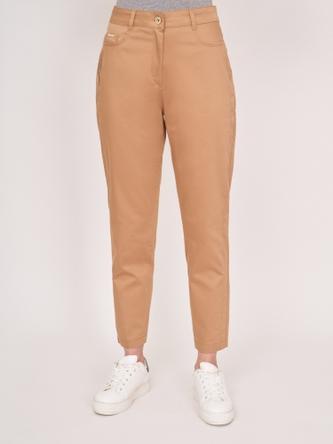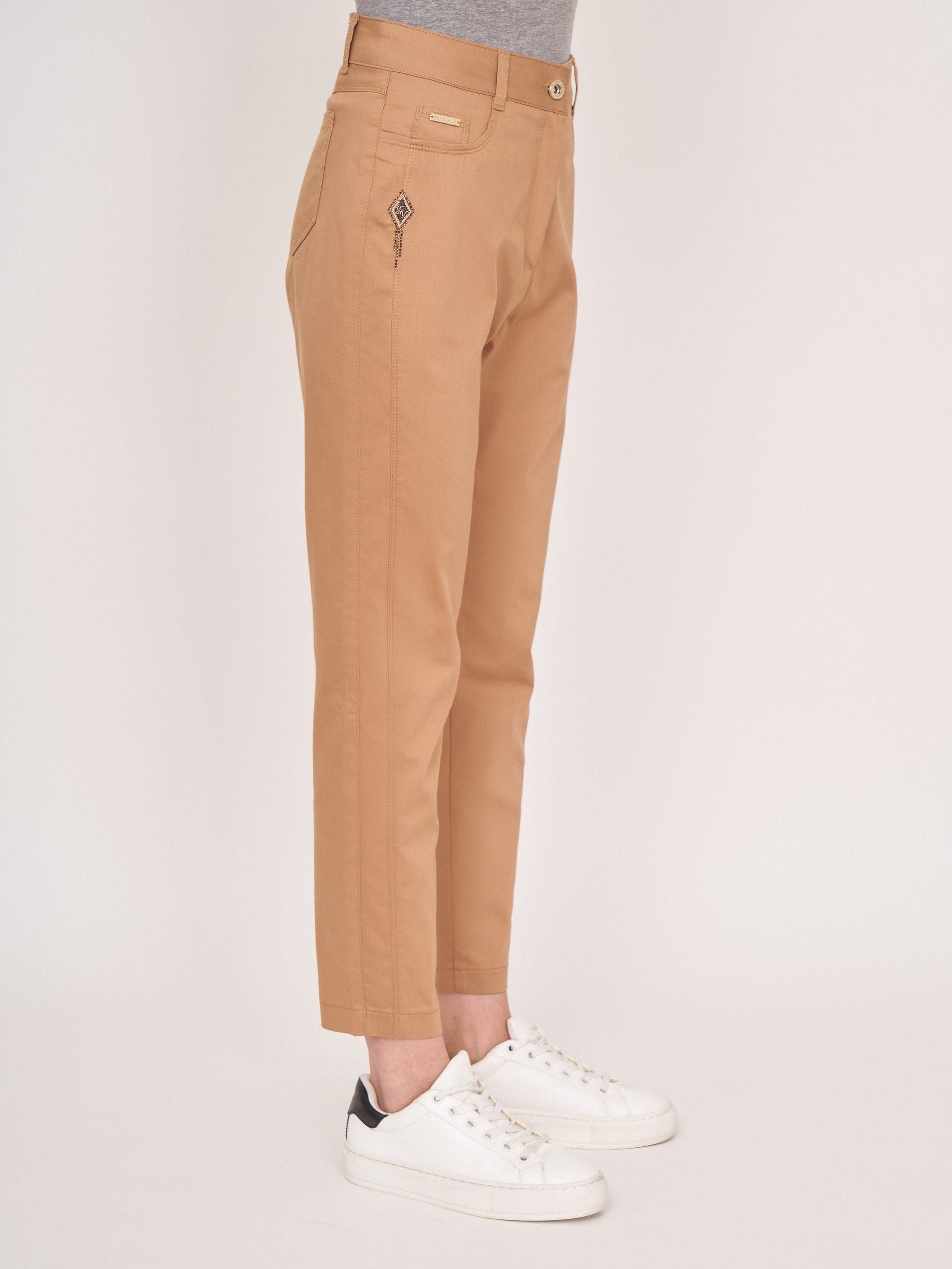 На сайте указаны российские размеры. Зауженные трикотажные темно-бежевые брюки на молнии, с накладными карманами, с вышивкой и стразами понизу с задней части брюк. Длина по спинке: 69 см. Рост модели: 176 см.