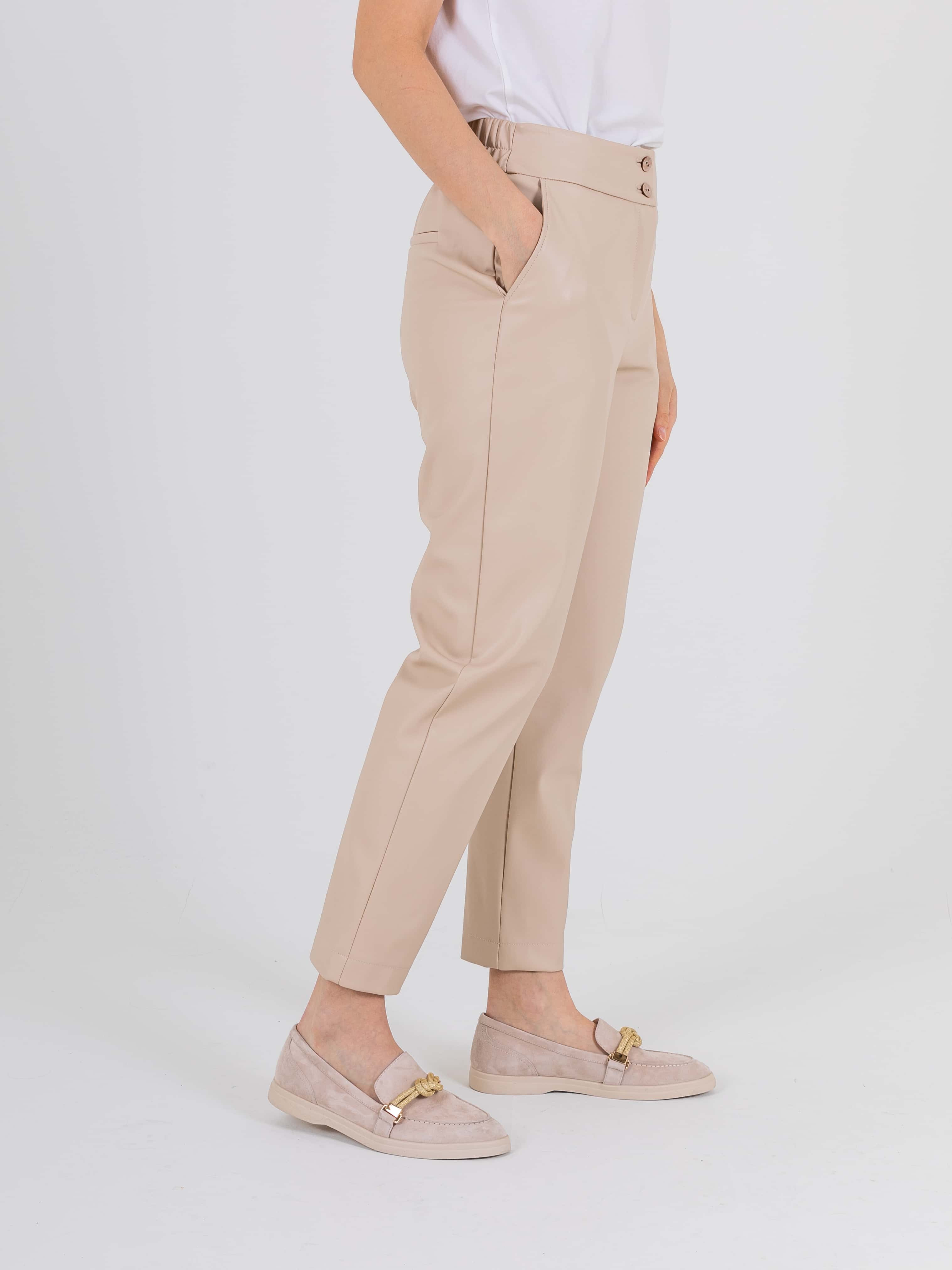 Брюки с завышенной талией длиной до щиколотки с застежкой на молнию и 2 пуговицы. Брюки слегка зауженные книзу. На передних половинках расположены два кармана с отрезным бочком. На задних половинках два прорезных кармана с листочками. Верх брюк обработан поясом на резинке.