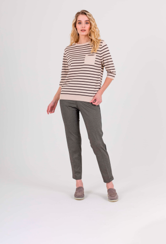 Прямые брюки с завышенной талией длиной до щиколотки с застежкой на молнию и 1 пуговицу, дизайнерская особенность модели – принт «клетка» и лампасы в боковых швах. Брюки слегка зауженные книзу. На передних половинках расположены два кармана с отрезным бочком. На задних половинках два прорезных кармана с листочками. Верх брюк обработан поясом на резинке со шлевками.