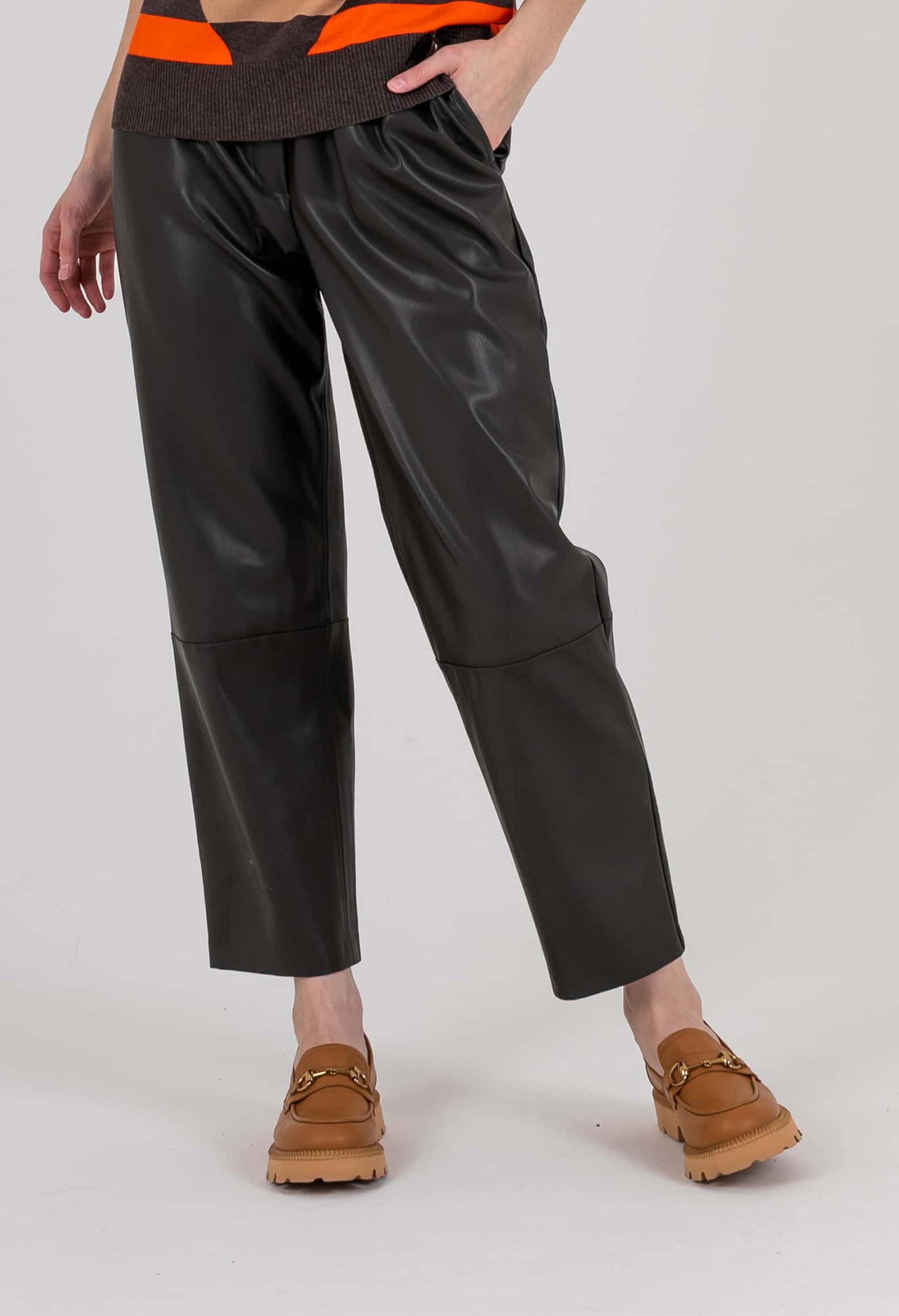 Брюки прямые со швами на коленях, с имитацией гульфика без застежки. На передних половинках расположены два кармана с отрезным бочком. Верх брюк обработан поясом на резинке со шнурами и металлическими наконечниками, для удобства регулировки.