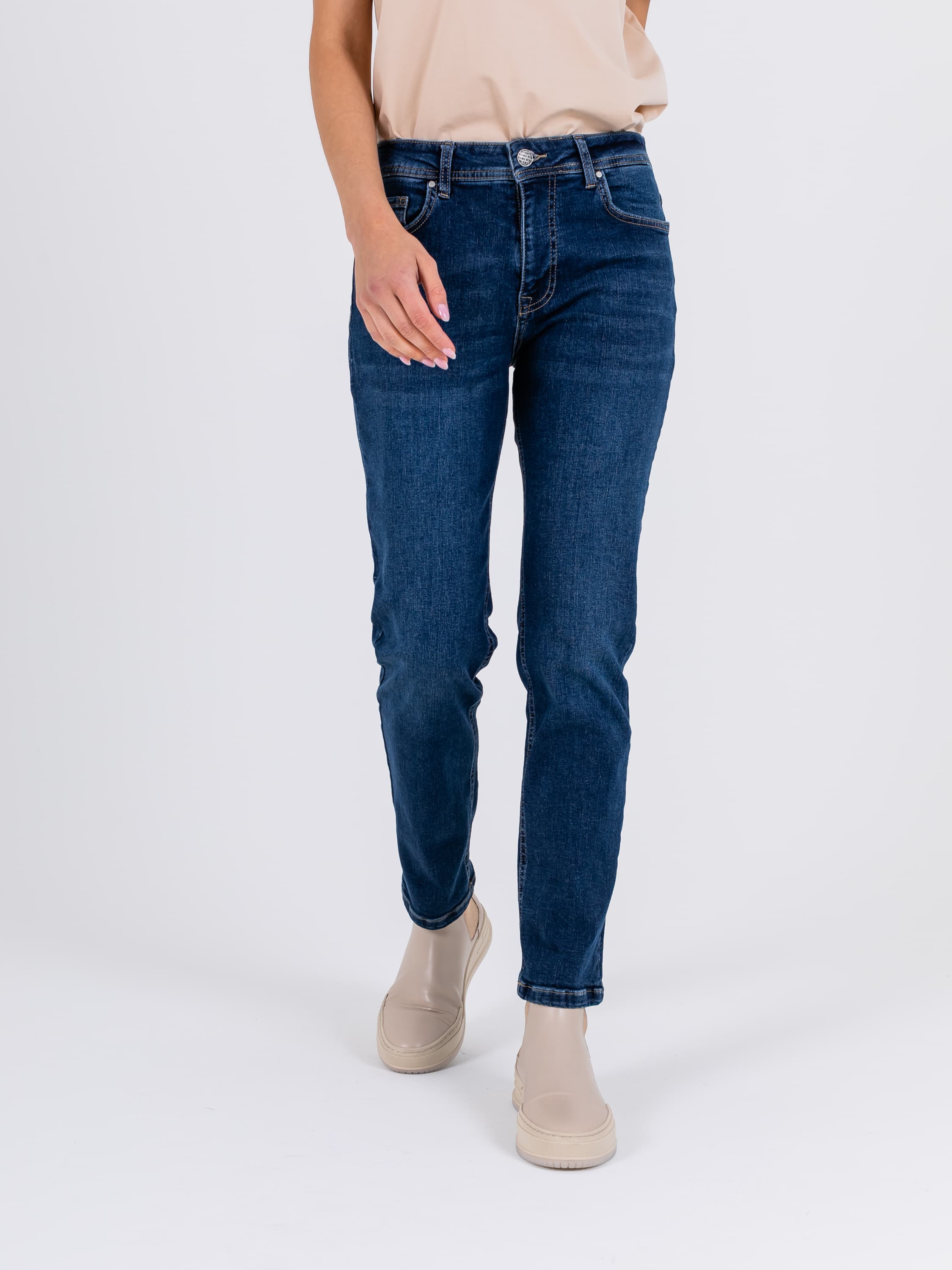Длинные джинсы «Slim Fit» с застежкой на молнию и 1 пуговицу. Джинсы слегка зауженные книзу, с легким варёным эффектом. На передних половинках расположены два кармана с отрезным бочком и один монетный карман. На задних половинках два накладных кармана и фигурная кокетка. Верх брюк обработан поясом со шлевками.