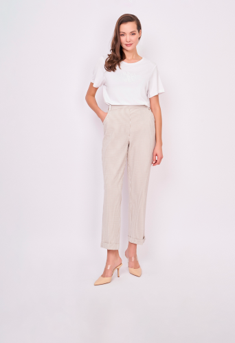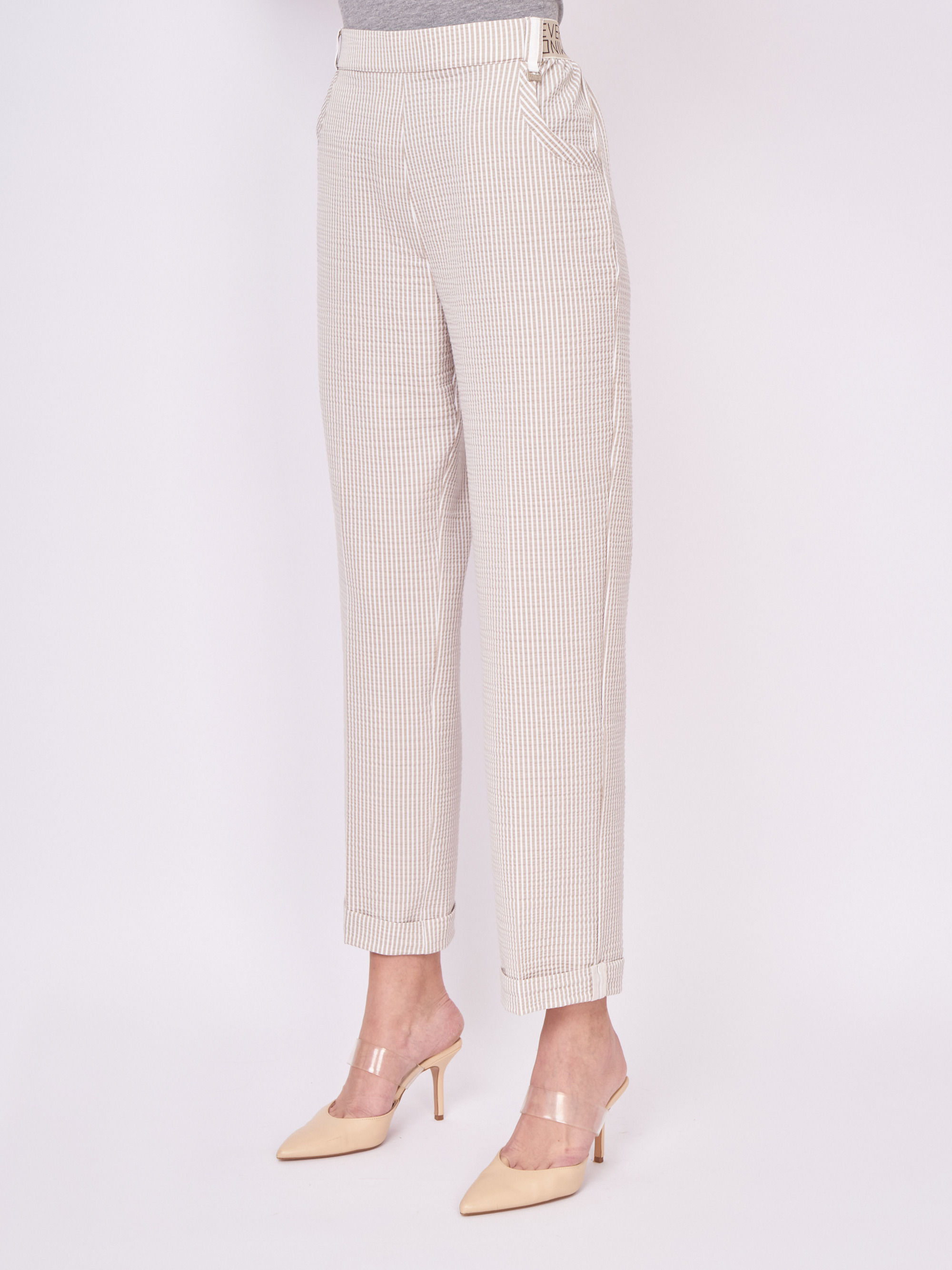 На сайте указаны российские размеры. Текстильные зауженные брюки в бело-бежевую полоску на резинке, с косыми карманами, с подворотами. Длина брючин: 71 см. Рост модели: 177 см.
