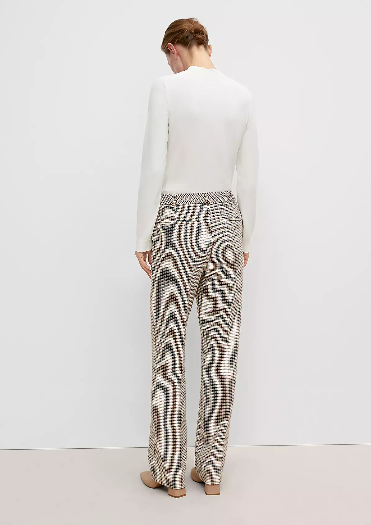 На сайте указаны российские размеры. Брюки классического кроя принта гусиная лапка. Застежка: молния, пуговица, крючок. Впереди прорезной карман, сзади ложный. Длина штанины по внутренней стороне для размера 42 около 78 см. Рост модели: 179 см