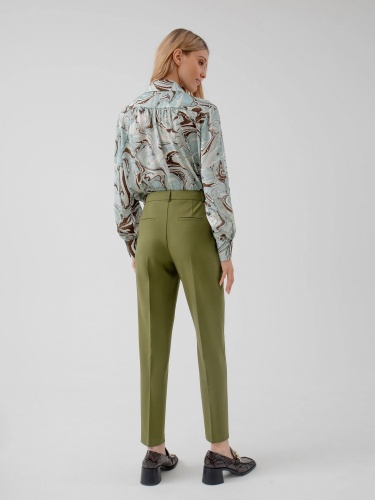 На сайте указаны российские размеры. Классические брюки со стрелками прямого силуэта на притачном поясе со шлевками и рабочими карманами по бокам фигурной формы. Застежка спереди на молнию и крючок. Сзади прорезные карманы с листочками. Рост модели 175 см.