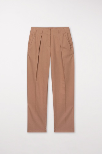 На сайте указаны российские размеры. Брюки из легкого габардина с летней текстурой крепа и зауженным кроем. Слегка укороченный фасон со складками спереди и широкими шлевками для ремня создает стильный образ. Рост модели 178 см.