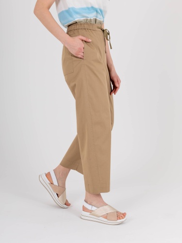 Джинсы «Carrot fit» с завышенной талией длиной до щиколотки с застежкой на молнию и 1 пуговицу. Джинсы слегка зауженные книзу. Два кармана в боковых швах с патами. На задних половинках фигурная кокетка и накладной карман. Верх брюк обработан поясом на резинке со шнуром.
