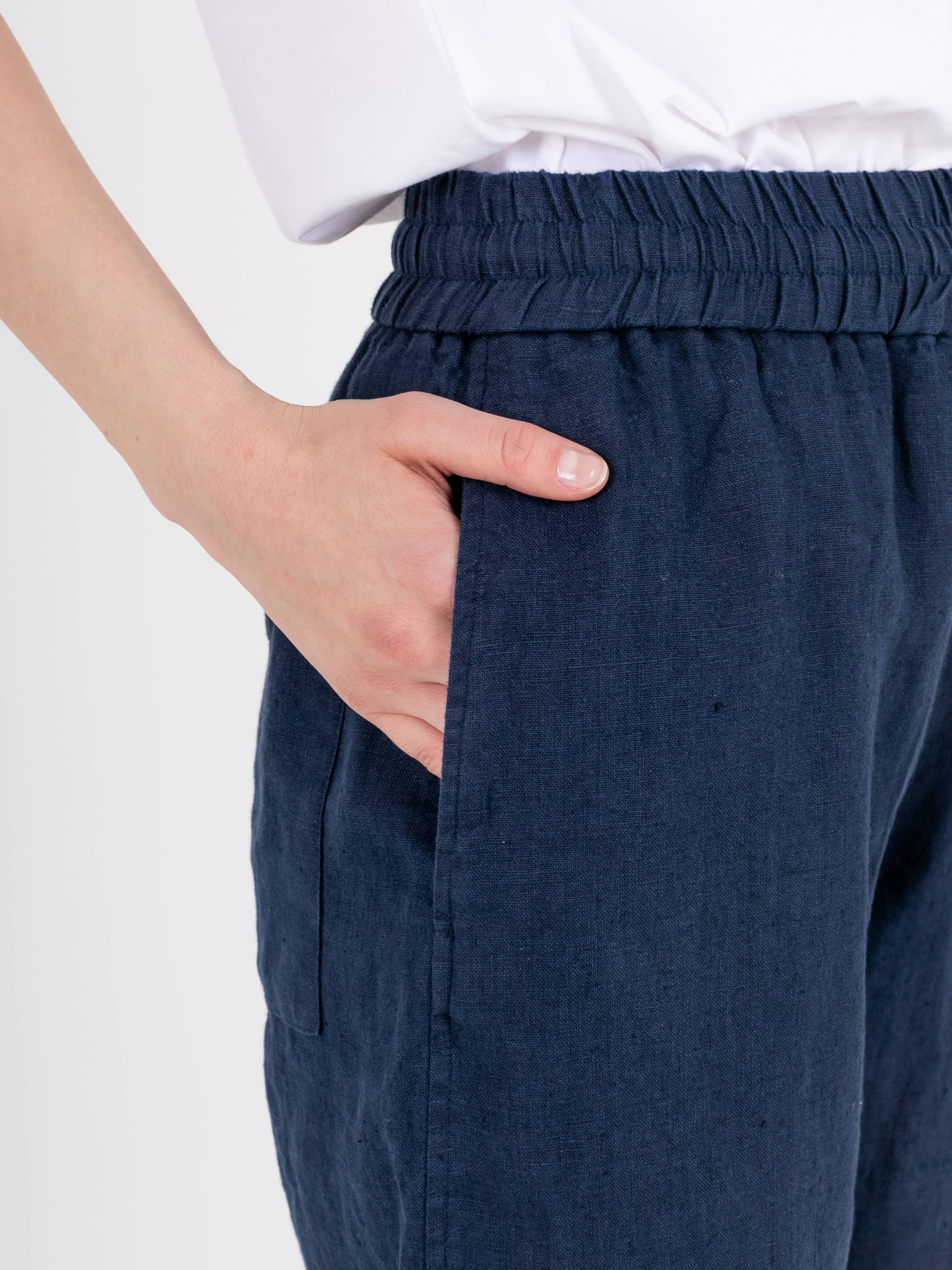 Прямые шорты-бермуды, длиной выше колен из натурального льна без застежки с карманами в боковых швах. На правой задней половинке накладной карман. Верх шорт обработан поясом на резинке.