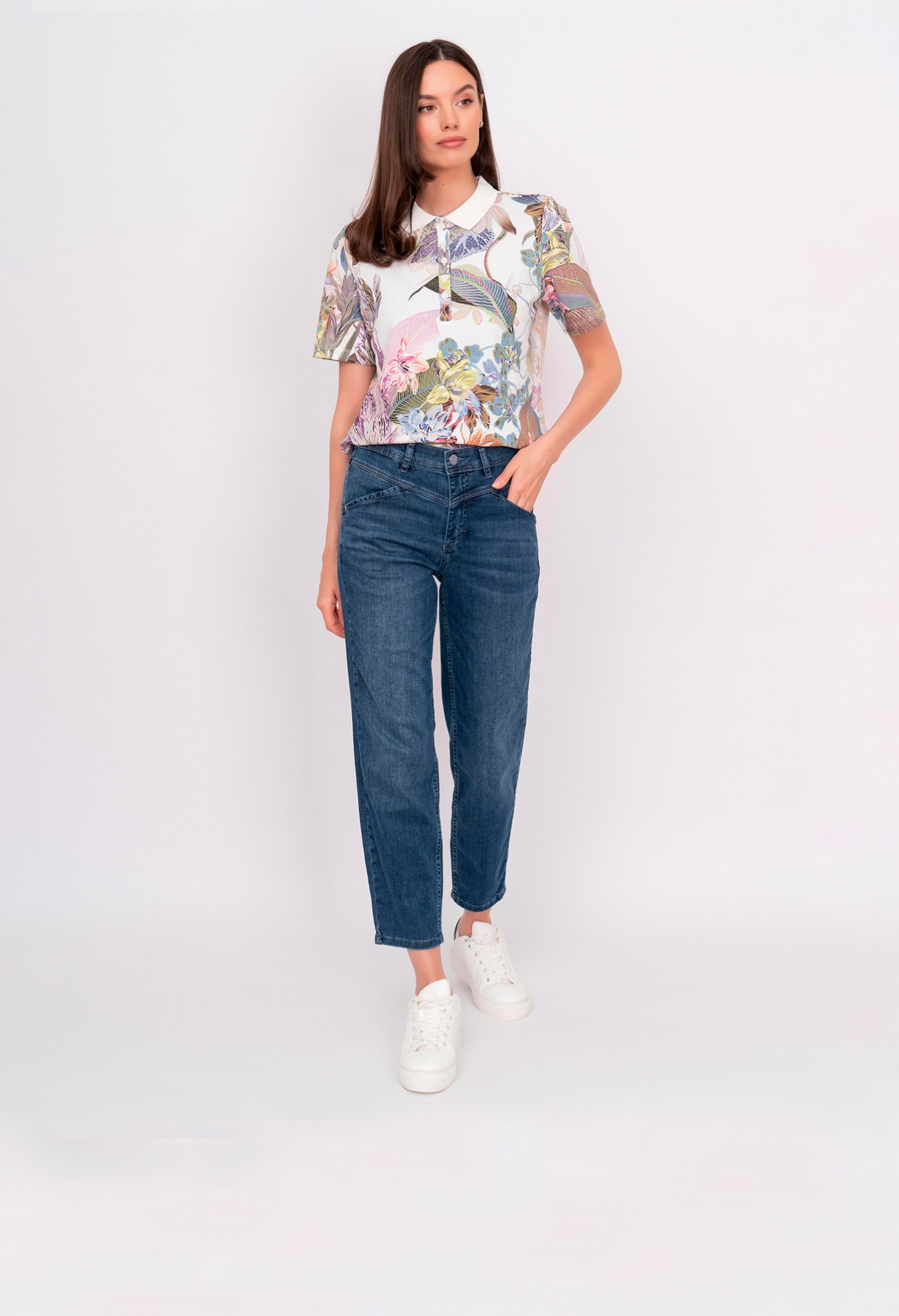 На сайте указаны российские размеры. Зауженные укороченные синие джинсы на молнии с косыми карманами, с накладными карманами. Рост модели 175 см. Длина брюк: 67 см.