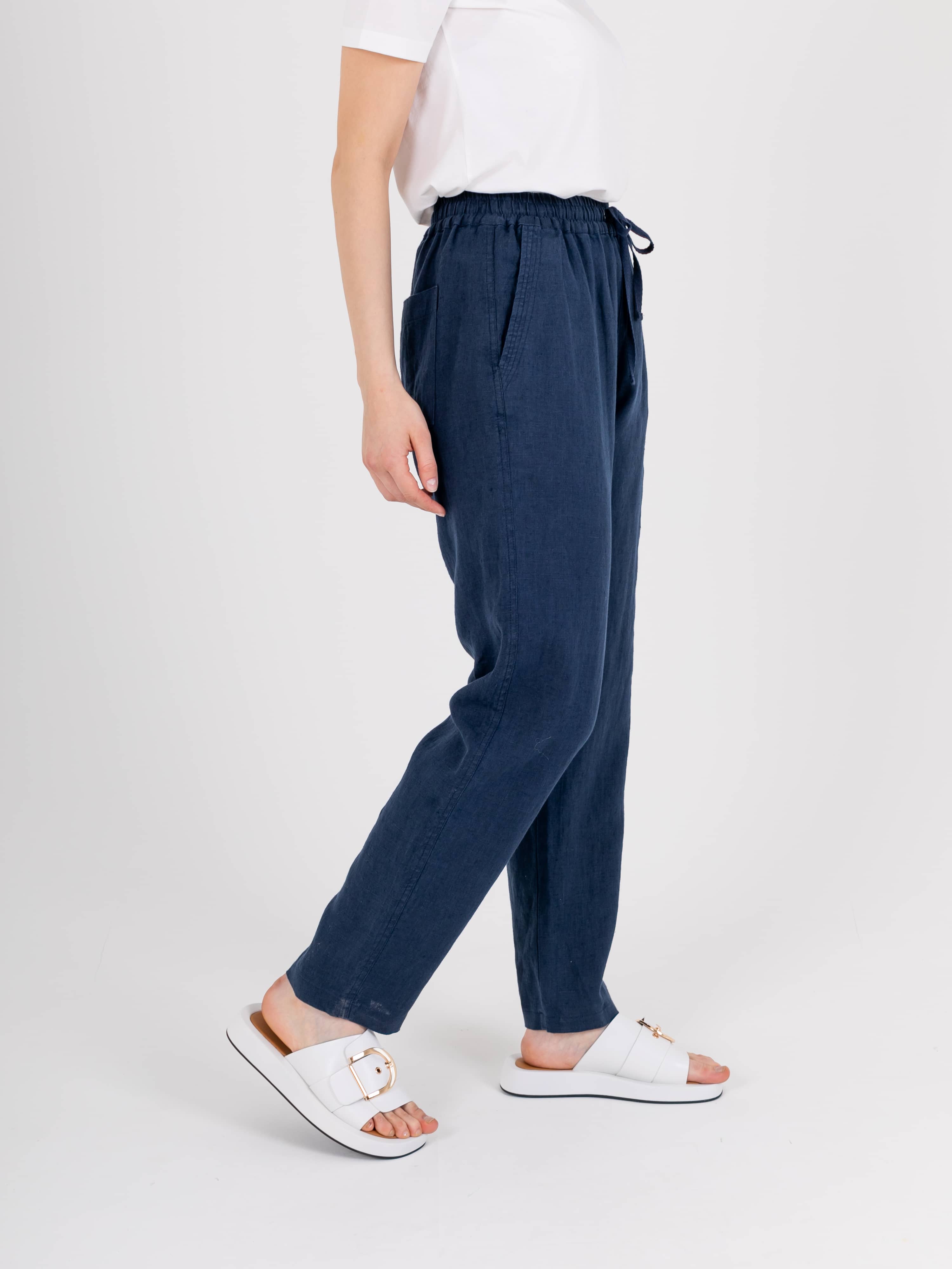 Прямые брюки с завышенной талией, длиной до щиколоток. На передних половинках расположены два кармана с отрезным бочком. На задних половинках брюк расположены накладные карманы. Верх брюк на резинке со шнуром для регулировки объема.