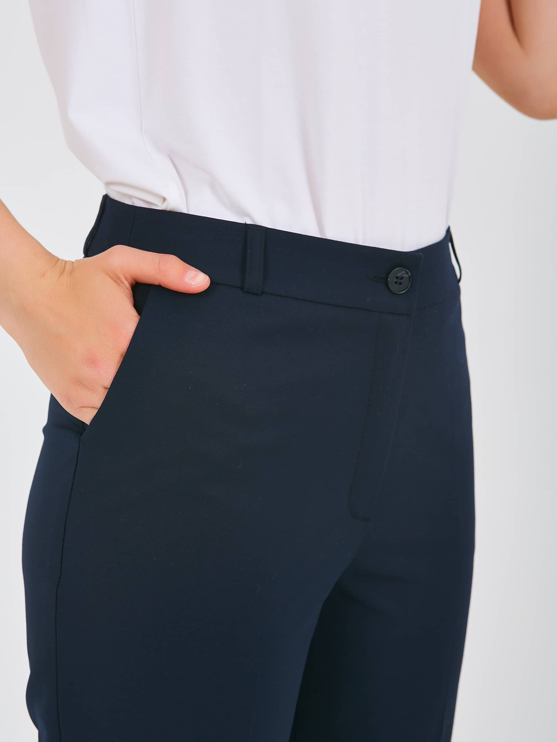 Прямые брюки с завышенной талией, длиной до щиколоток с застежкой на молнию и 1 пуговицу. Брюки слегка зауженные книзу. На передних половинках расположены два кармана с отрезным бочком. Верх брюк обработан поясом со шлевками.