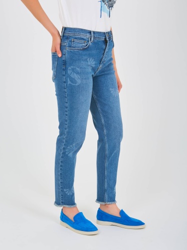 Джинсы «mom» длиной до щиколотки с застежкой на молнию и 1 пуговицу, дизайнерская особенность модели – на передних половинках цветочный принт с логотипом «Stern», вареный эффект и необработанный низ. Джинсы слегка зауженные книзу. На передних половинках расположены два кармана с отрезным бочком и один монетный карман. На задних половинках два накладных кармана и фигурная кокетка. Верх брюк обработан поясом со шлевками.