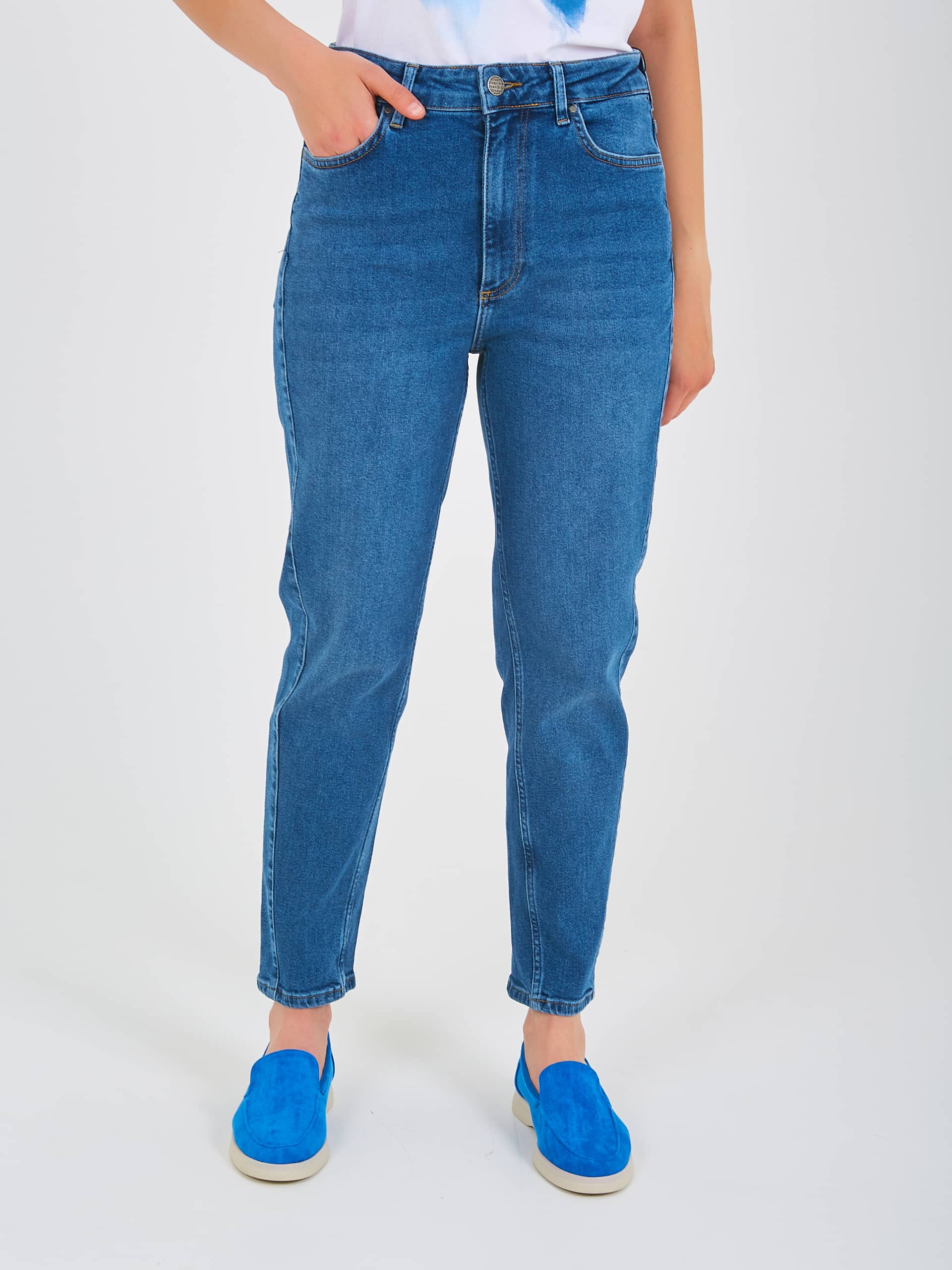 Джинсы «mom» длиной до щиколотки с застежкой на молнию и 1 пуговицу. Джинсы слегка зауженные книзу. На передних половинках расположены два кармана с отрезным бочком и один монетный карман. На задних половинках два накладных кармана и фигурная кокетка. Верх брюк обработан поясом со шлевками.