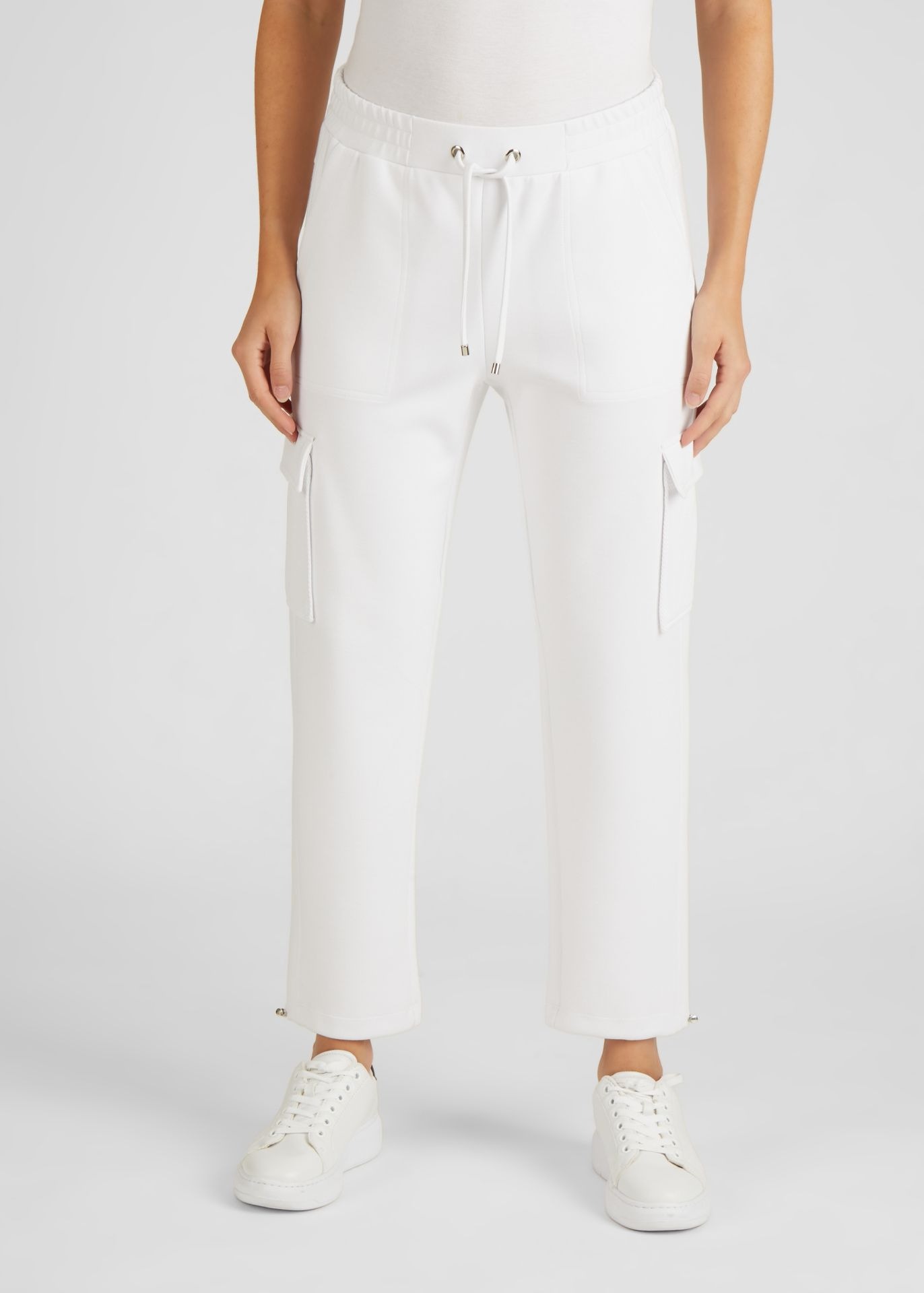 Спортивные штаны с эластичным поясом. Брюки можно варьировать благодаря эластичному поясу с кулиской, а кулиски на штанинах обеспечивают идеальную посадку. Накладные карманы на бедрах придают модели современный вид. Носите брюки небрежно с футболкой и кроссовками. Внутренний шов в размере 46: 67 см.