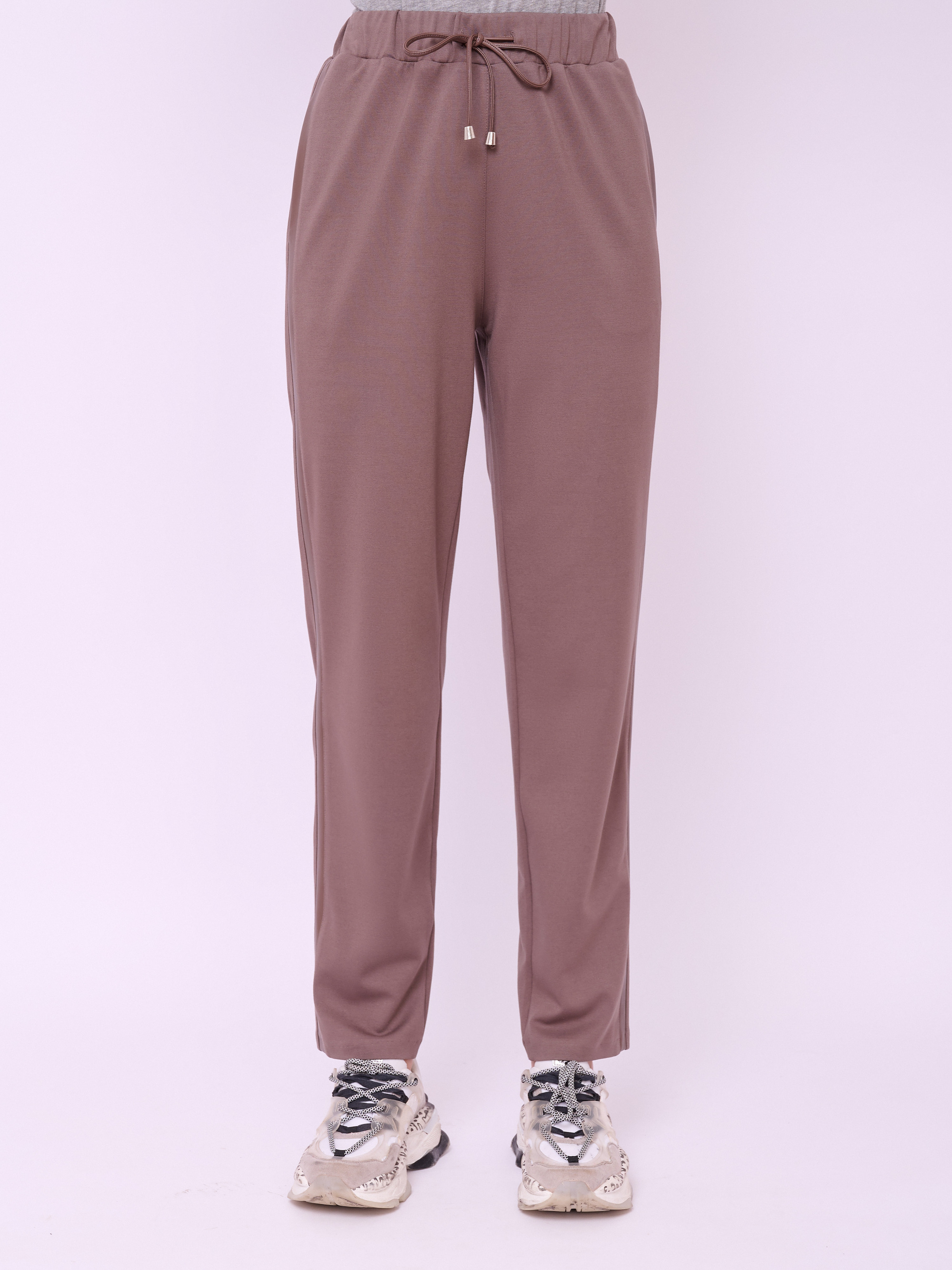 Трикотажные зауженные комфортные брюки на резинке и кулиске с косыми карманами и лампасами из искусственной кожи. Длина брючин: 79 см.