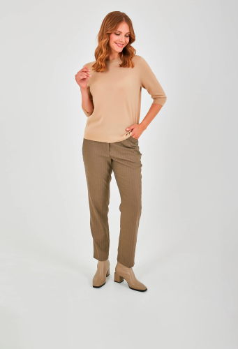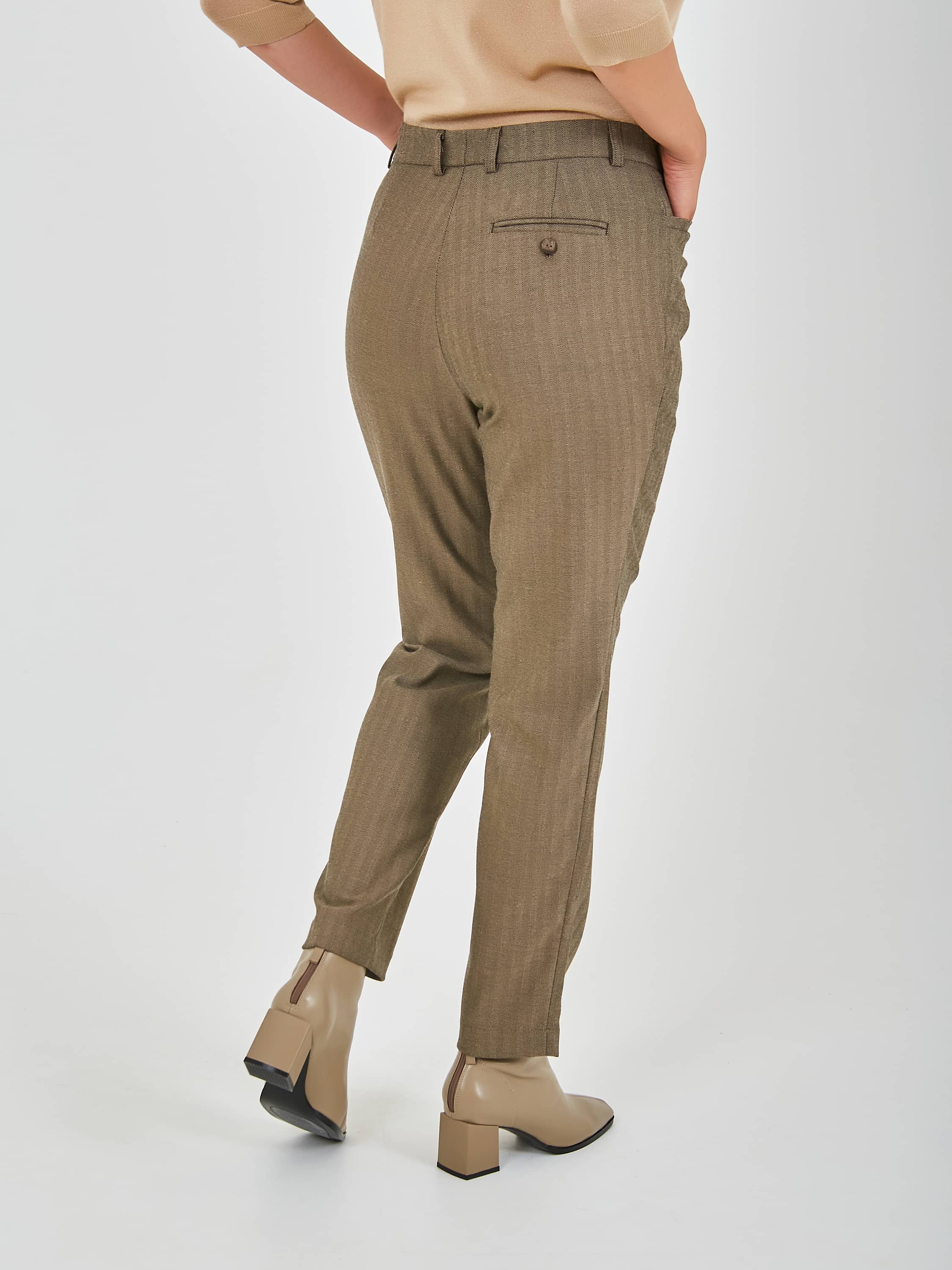 Длинные прямые брюки, с застежкой на молнию и одну пуговицу, дизайнерская особенность модели - рисунок "ёлочка". Брюки зауженные книзу. На передних половинках расположены два кармана с отрезным бочком и листочкой. На задних половинках также расположены два кармана с листочкой. Верх брюк обработан поясом и шлевками.