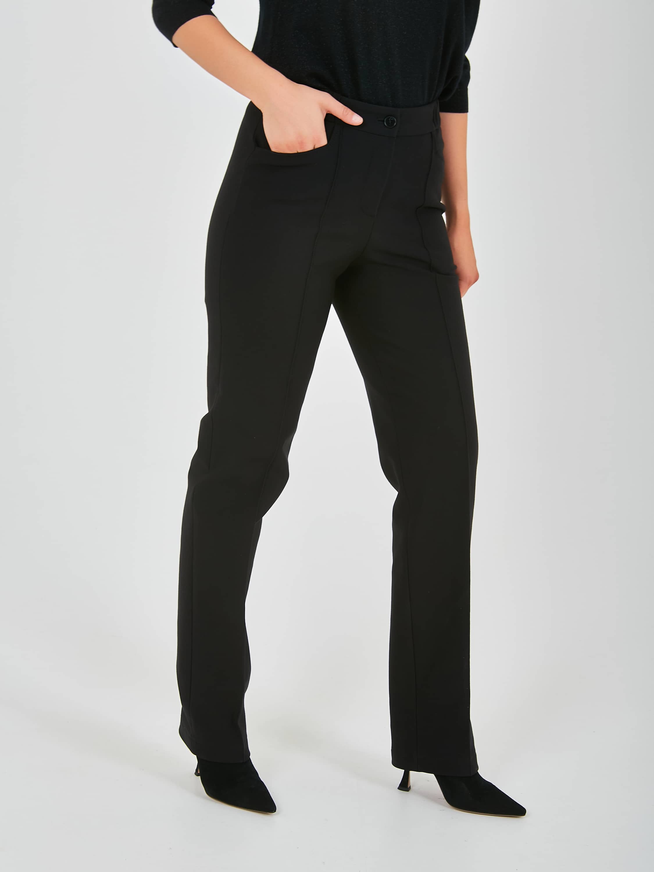 Длинные прямые брюки, с застежкой на молнию и одну пуговицу. Брюки, слегка зауженные книзу. На передних половинках расположены два кармана с отрезным бочком, а также декоративные швы, имитирующие стрелки, по всей длине брючины. Верх брюк обработан поясом на резинке.