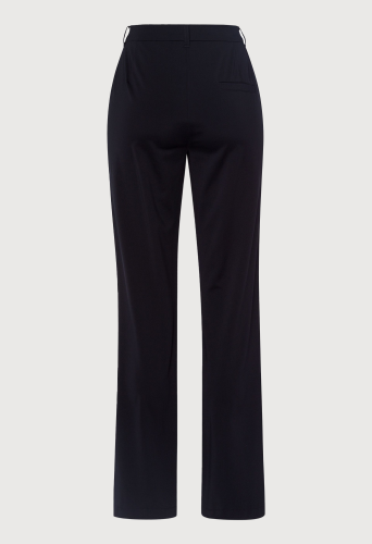 Брюки женские с декоративным прорезным карманом сзади. Прямые брючины облегают фигуру, эластичный трикотаж, за которым легко ухаживать, имеет струящуюся драпировку и мягкий на ощупь. Вневременной однотонный образ дополнен изящным принтом на левом кармане брюк