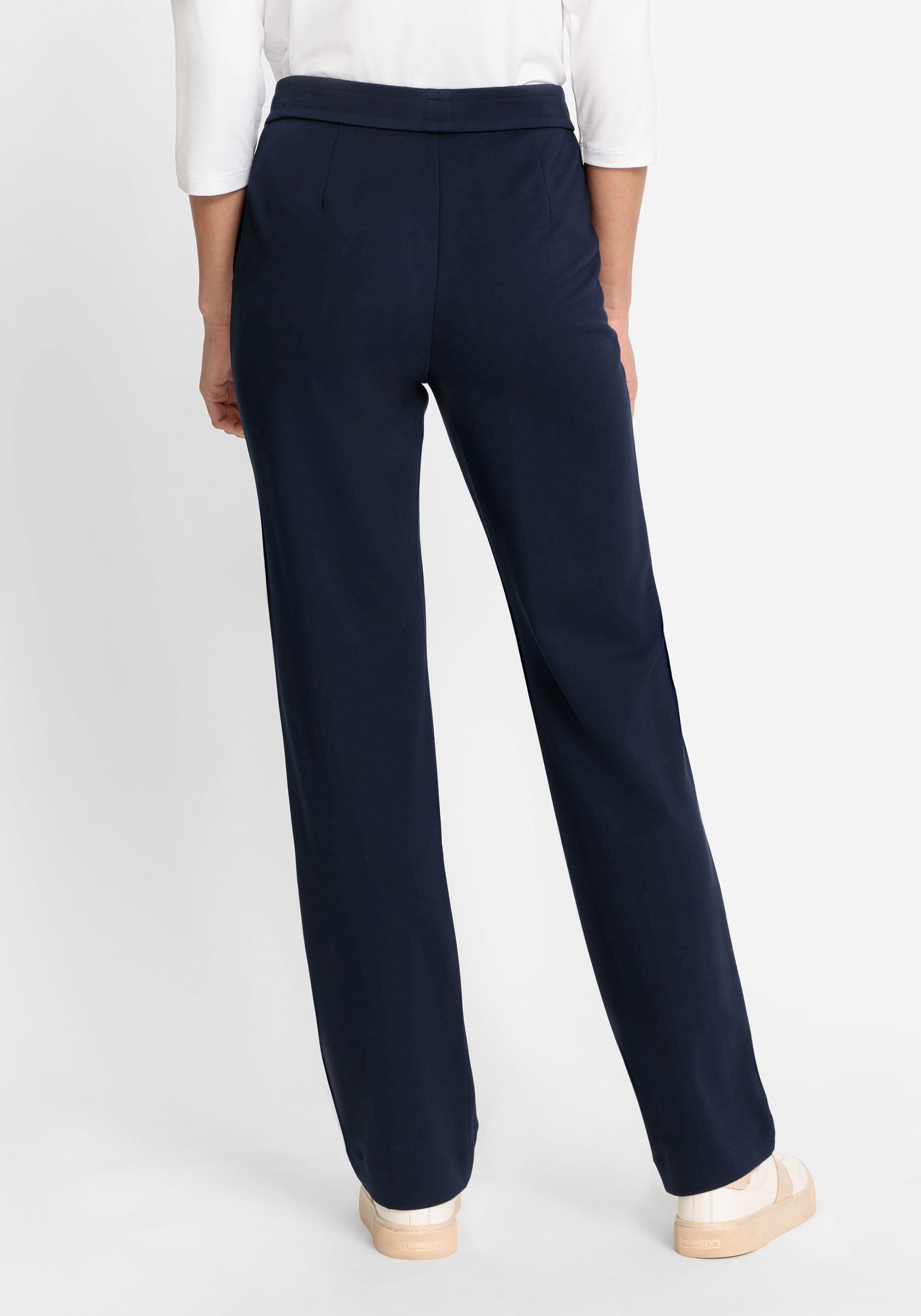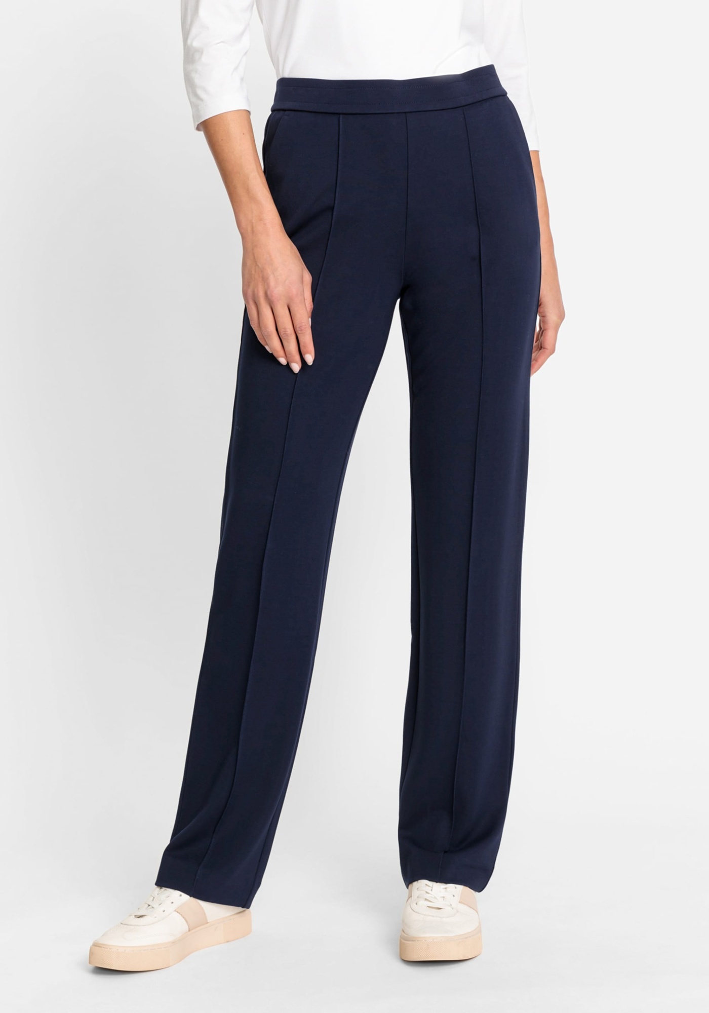 Брюки из мягкого трикотажа с легким блеском, с эластичным поясом, прорезными боковыми карманами и передними швами по центру штанин. Эти брюки очень эластичны! В модели Mona они обеспечивают расслабленное прилегание к бедрам и сидят точно на естественной линии талии, создавая эффект удлинения ног.