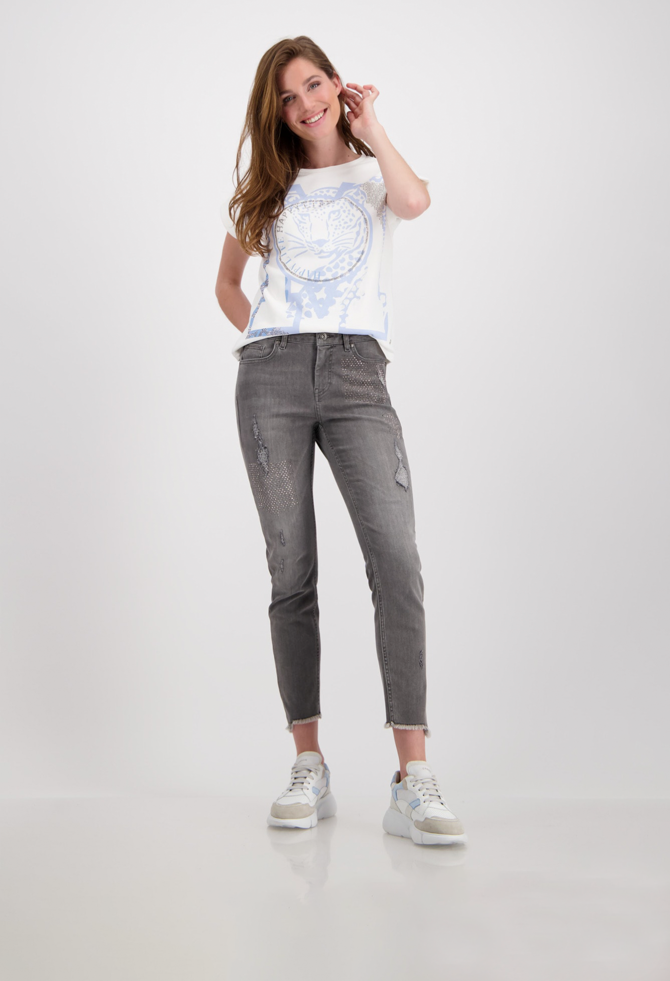 Джинсы узкого кроя имеют особые изюминки, такие как потрепанные детали со стразами и бахрома на отдельных манжетах. Высокое содержание хлопка и легкая эластичность гарантируют идеальную посадку. Длина внутренней штанины для всех размеров 70 см.
