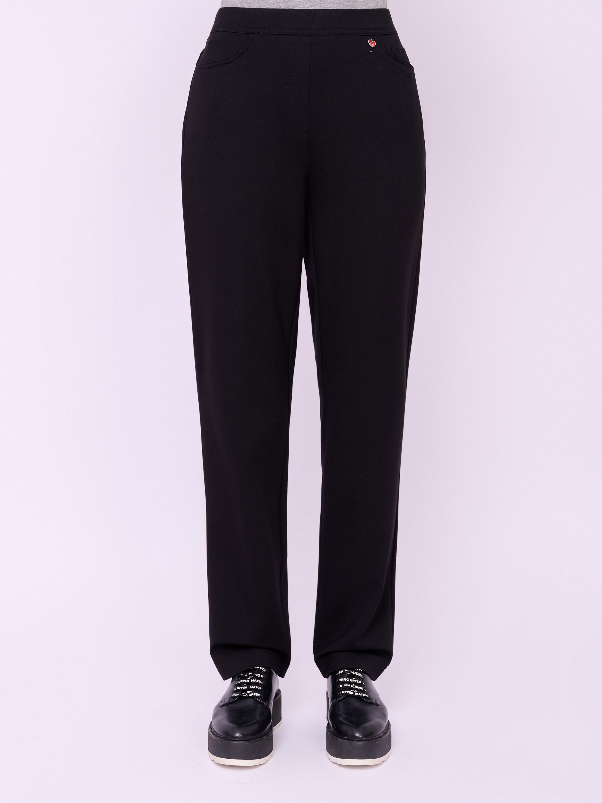 Детали: трикотажные брюки, плотный трикотаж, без застежки, пояс на резинке, без рисунка, карманы накладные, крой брючин зауженный, посадка средняя.