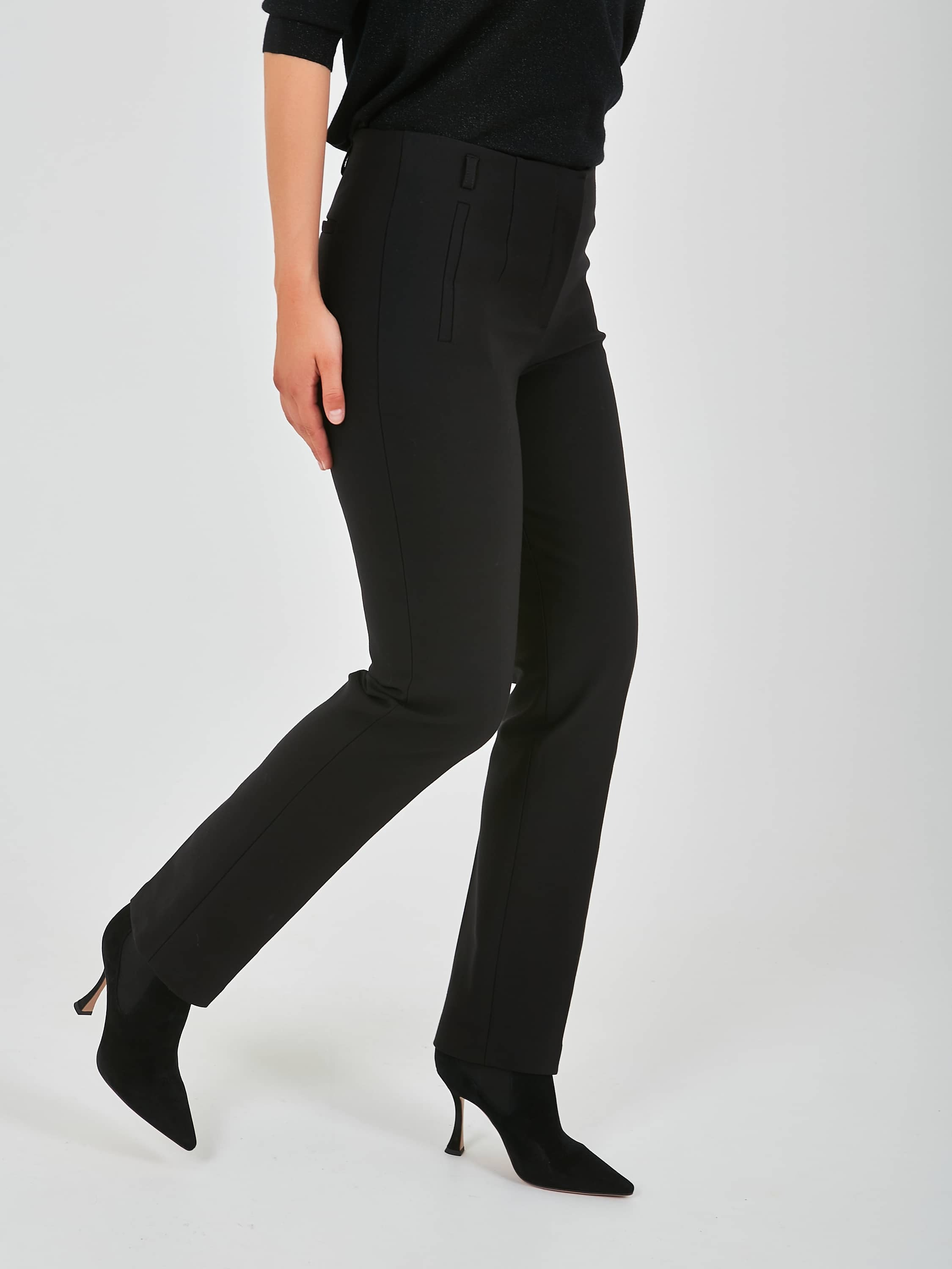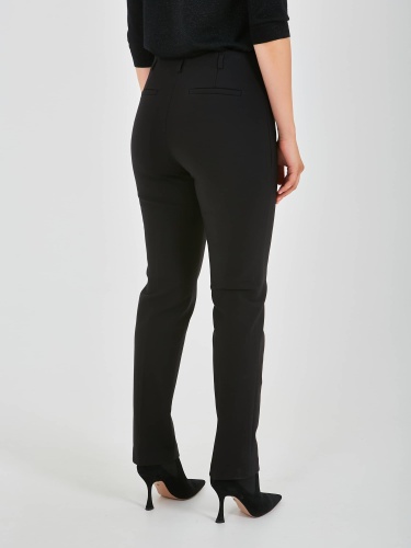Длинные прямые брюки, с застежкой на молнию и крючок. Брюки зауженные к низу. На передних половинках расположены два кармана с листочкой. На задних половинках также расположены два кармана с листочкой. Верх брюк обработан обтачкой и шлевками.