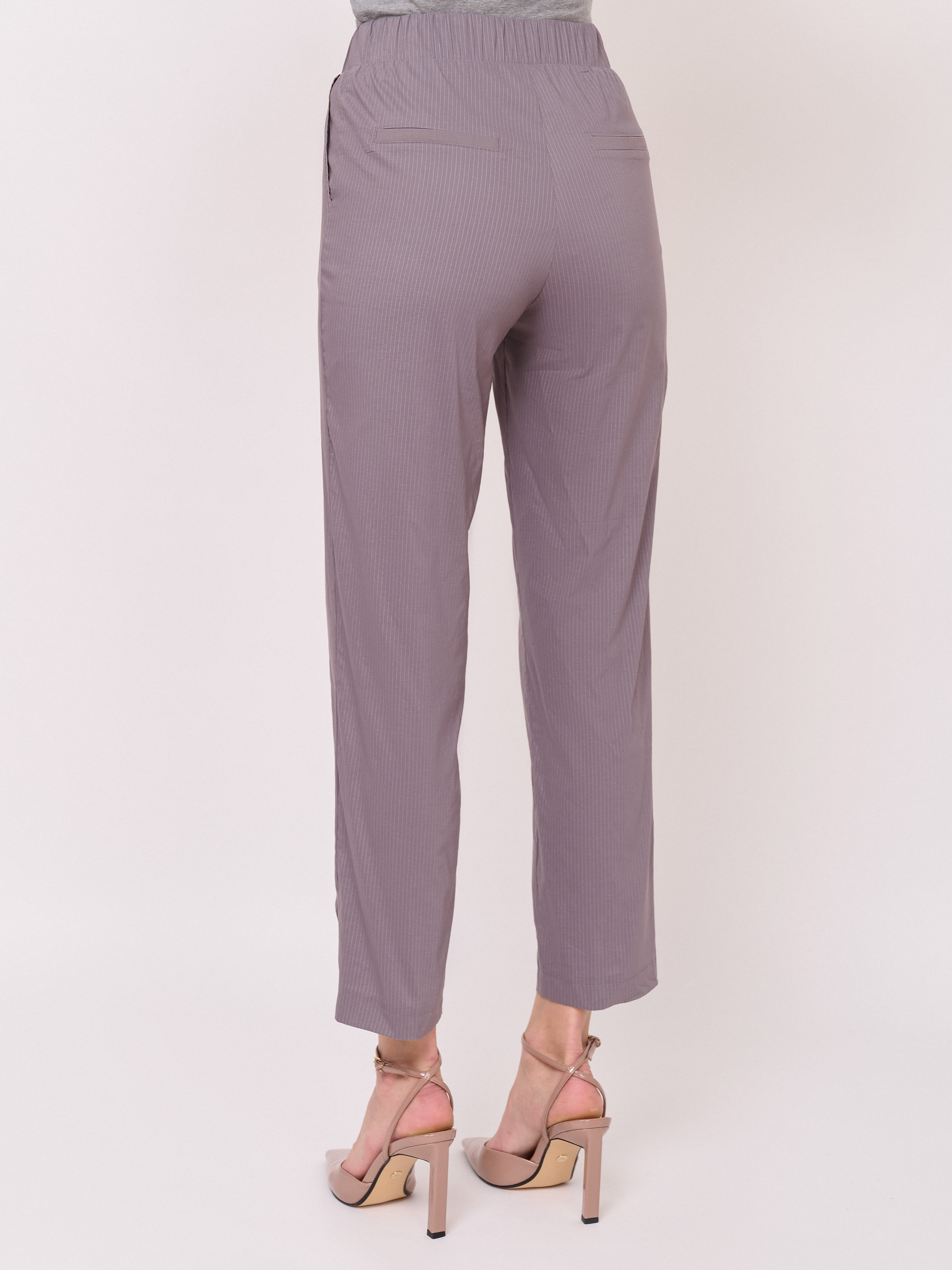 Детали: эластичный текстиль, пояс на резинке, рисунок полоска, карманы косые, крой брючин зауженный, посадка средняя. Длина брючин: 70 см.