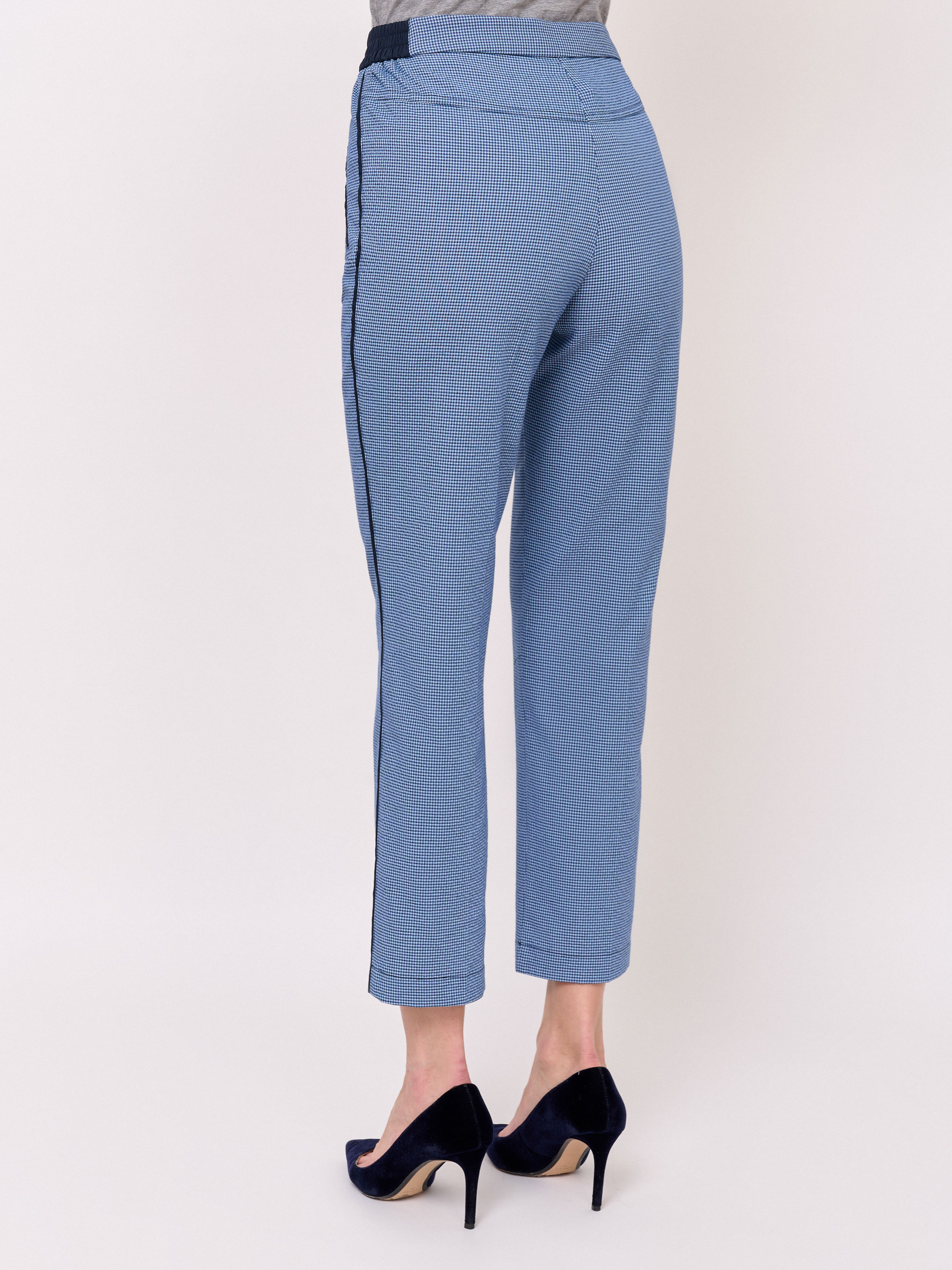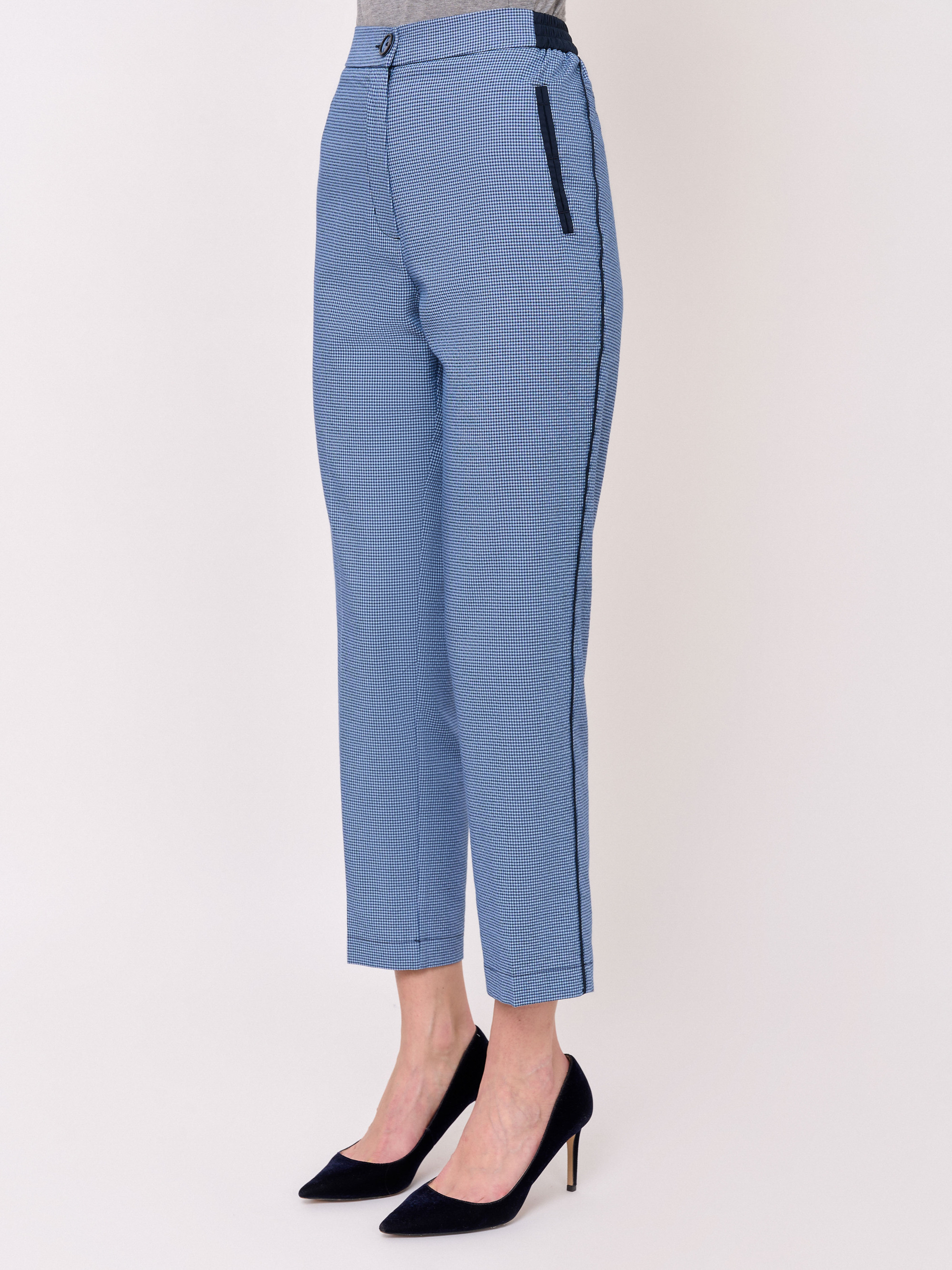 Детали: застежка молния, бокове эластичные вставки на поясе, рисунок клетка, без карманов, крой брючин зауженный, посадка средняя. Длина брючин: 70 см.