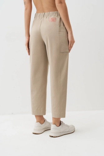 Брюки зауженные к низу, длиной 7/8. Застежка, гульфик, на четыре пуговицы и прорезные (под углом) петли. Боковой накладной карман. Правая задняя половинка брюк, в области пояса, декорирована термопринтом.