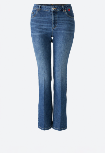 Эластичная смесь хлопка, аутентичная стирка среднего синего цвета. Средняя талия, стандартная длина, модный расклешенный крой. С молнией и пуговицей с логотипом, петлями для ремня. Типичные сумки с пятью карманами. Любимая деталь: маленькая вышивка в виде сердечек на сумке. Эластомультиэстер с превосходными свойствами растяжения и отскока. Длина для размера 36: 80 см.