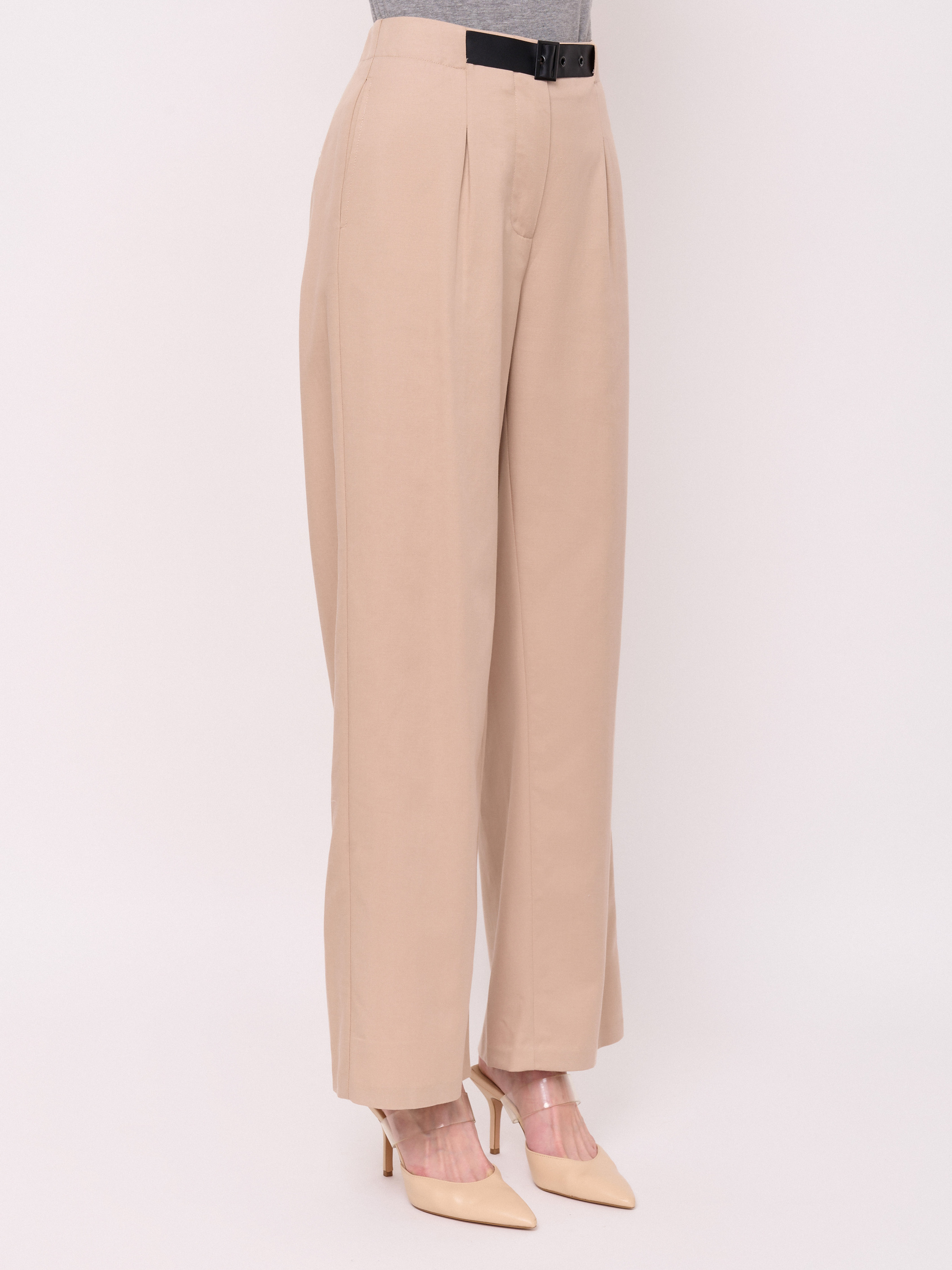 Детали: застежка молния, без рисунка, карманы в шве, крой брючин широкий, посадка средняя, текстильный ремень, складки. Длина брючин: 76. Идеально с жакетом UNQ (арт. 24110010144)