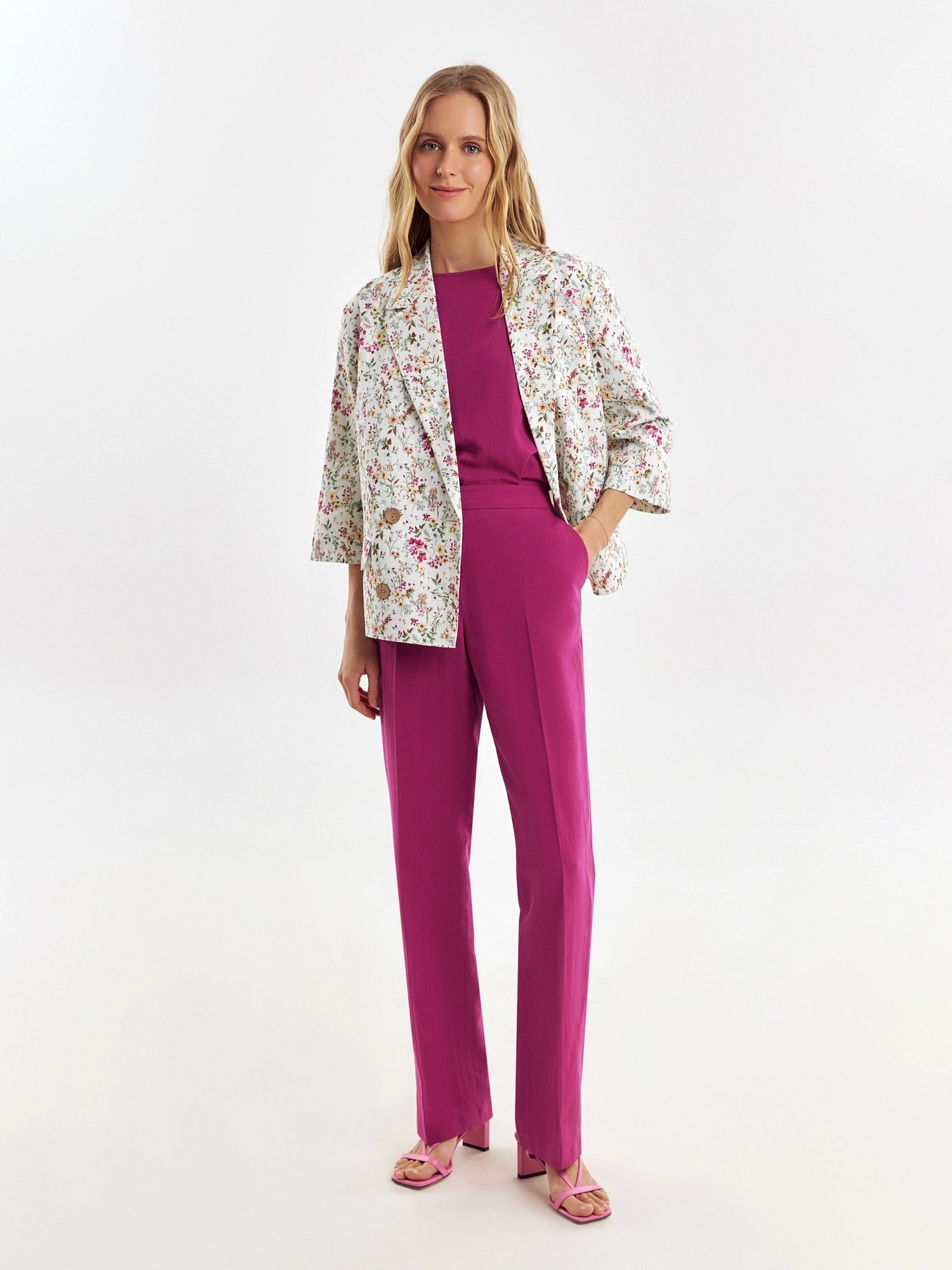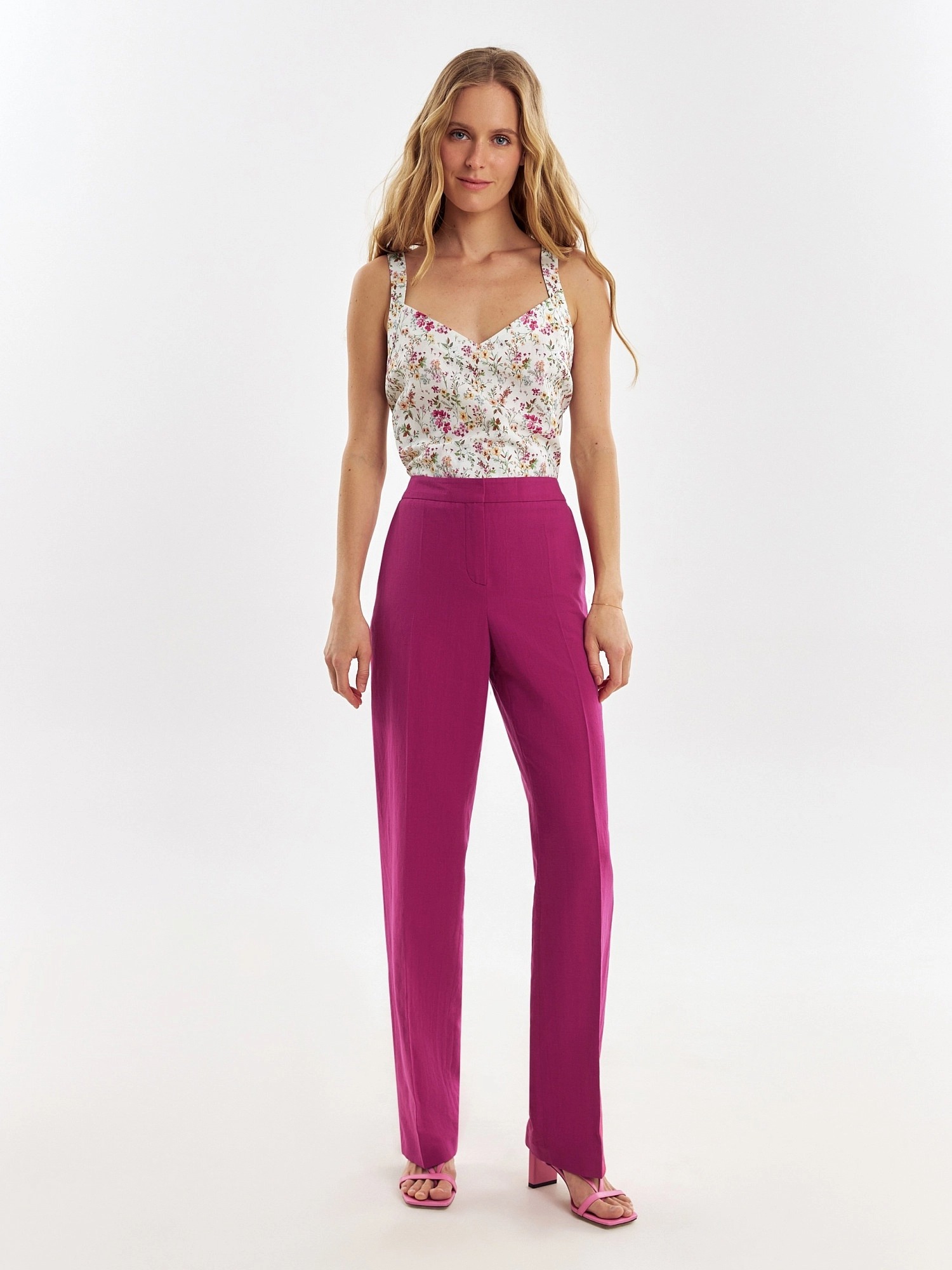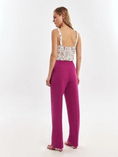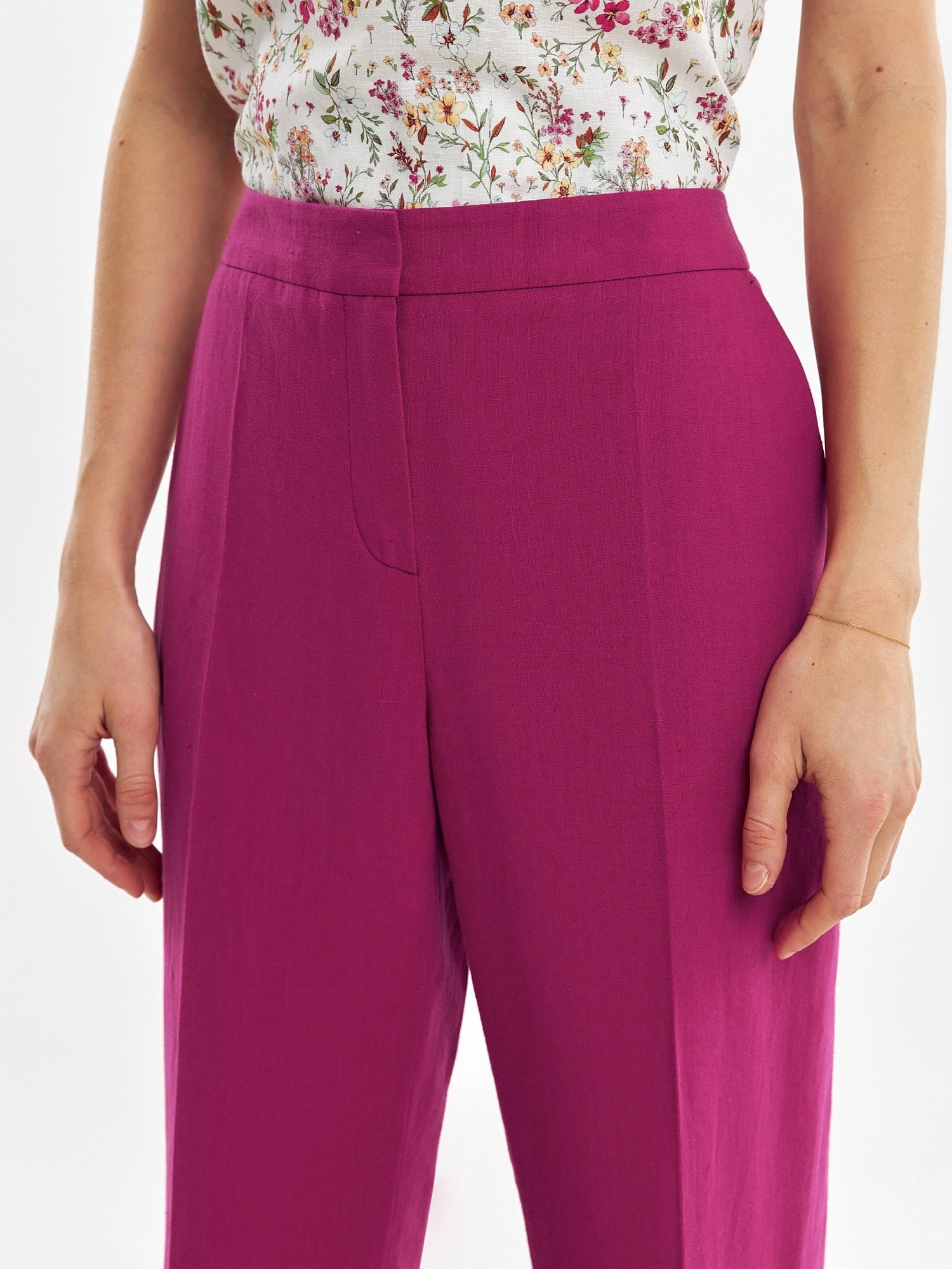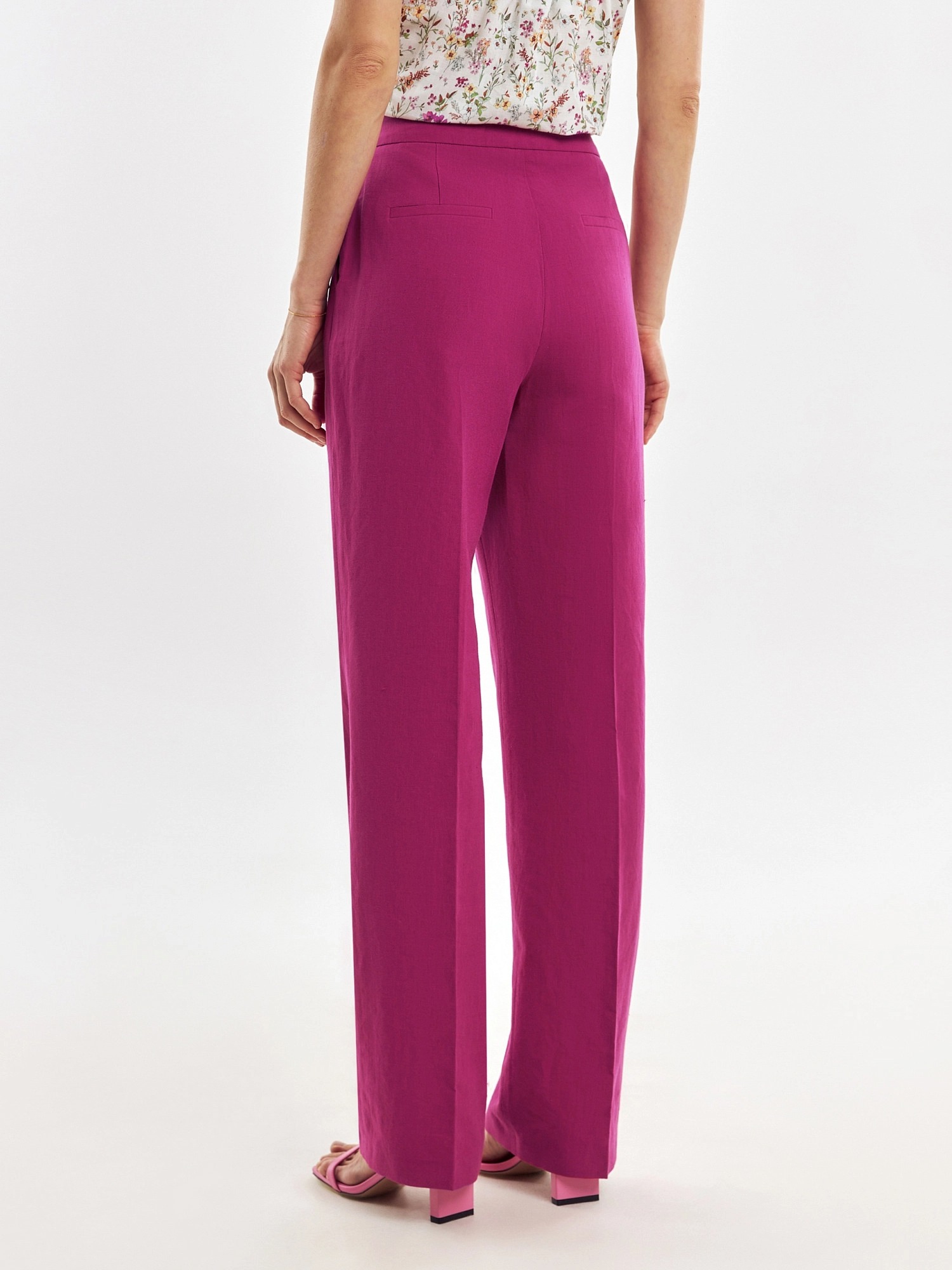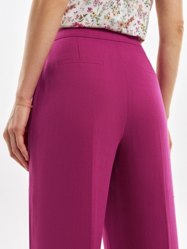 Элегантные брюки из льняной ткани цвета цикламен, прямого силуэта со стрелками на притачном поясе. Застежка спереди на молнию. Карманы в боковых швах.