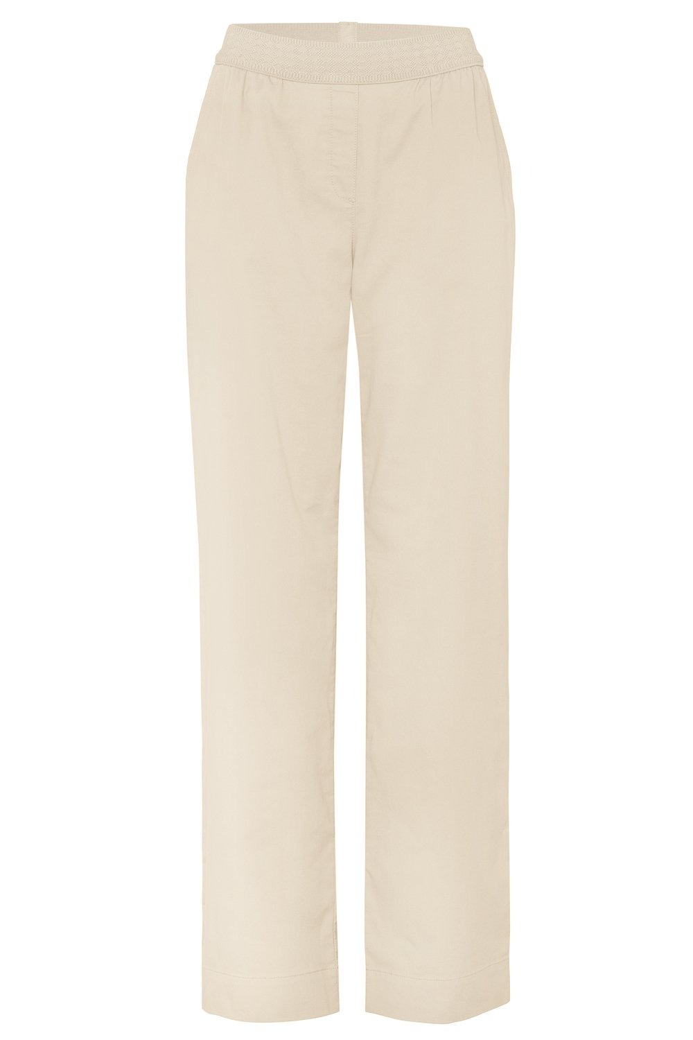 Широкие штанины из особо легкой смеси хлопка, с эластичной резинкой и широкими штанинами. Длина брюк в 44 размере - 82 см.